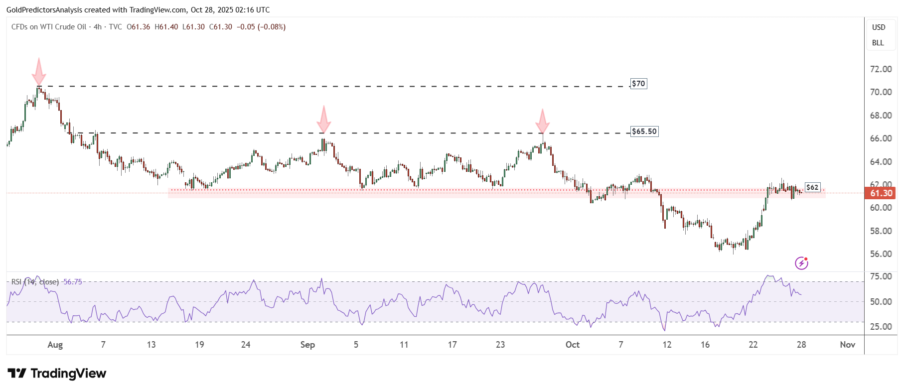Nếu giá vượt qua 66 USD, khả năng mở ra một nhịp tăng mạnh mới là rất lớn. Bên cạnh đó, chỉ báo RSI đã trở lại trên mức trung bình, củng cố triển vọng tăng giá. Tuy nhiên, nếu giá quay lại dưới 60 USD hoặc xu hướng hợp nhất kéo dài yếu đi, áp lực giảm có thể quay trở lại đối với dầu WTI.