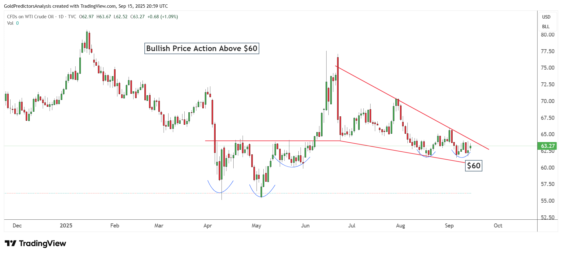 Ngoài ra, giá WTI cũng đang tích lũy gần cạnh trên mô hình tam giác trong vùng 60.00 USD, cho thấy tiềm năng bứt phá tăng. Sự hình thành đáy đôi quanh 55.00 USD hồi tháng 4 và tháng 5/2025 củng cố triển vọng này. Việc bứt phá trên 65.00 USD sẽ xác nhận một nhịp tăng, với mục tiêu tiến về vùng 75.00 USD.