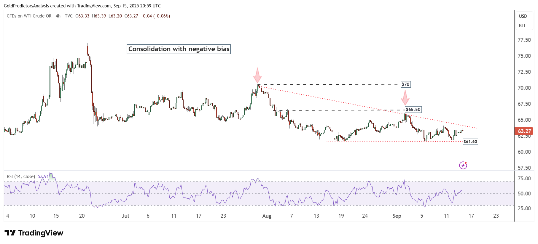 Trên khung 4 giờ, WTI tiếp tục dao động tích lũy trong mô hình tam giác. Nếu bứt phá trên 65.00 USD, tiềm năng tăng sẽ được củng cố. Ngược lại, nếu thủng mốc 61.60 USD, mô hình sẽ bị phá vỡ và xu hướng giảm quay trở lại.