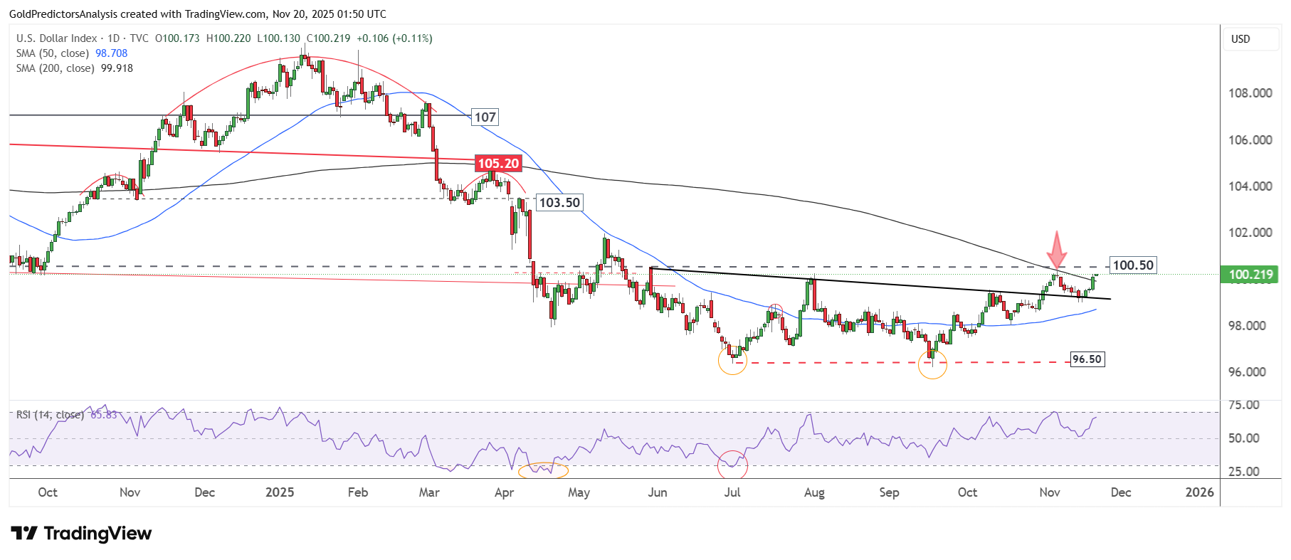 Biểu đồ ngày của chỉ số USD cho thấy khả năng bật tăng từ đường xu hướng đen gần vùng 99, với mục tiêu hướng đến 100.50. Một phá vỡ trên 100.50 có thể đưa chỉ số tăng cao hơn về vùng 102. Tuy nhiên, phá vỡ dưới 98 có thể kéo chỉ số về khu vực 96.50.