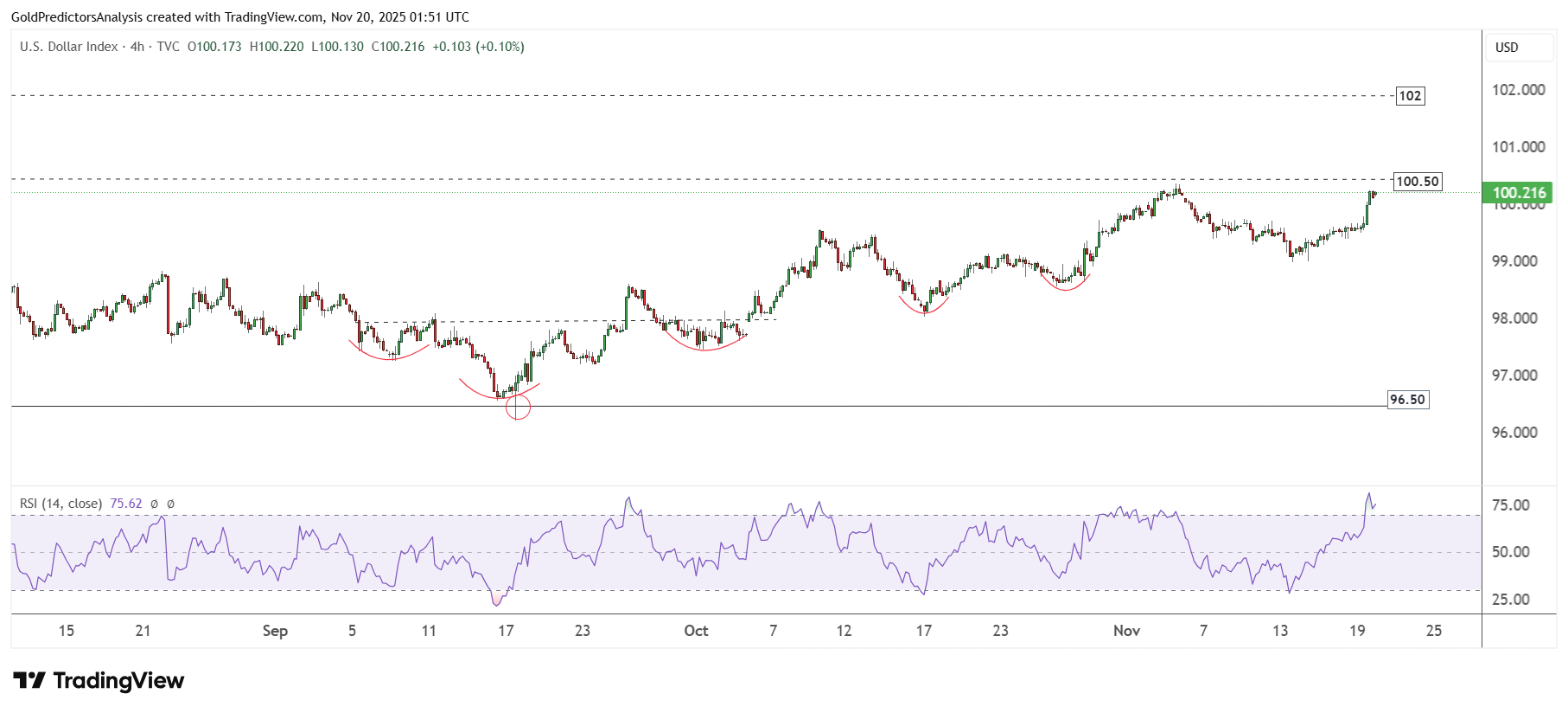 Biểu đồ 4 giờ của chỉ số USD cho thấy sự củng cố vững giữa hai mức 96.50 và 100.50. Một phá vỡ lên trên hoặc xuống dưới phạm vi này có thể xác định động thái quan trọng tiếp theo.