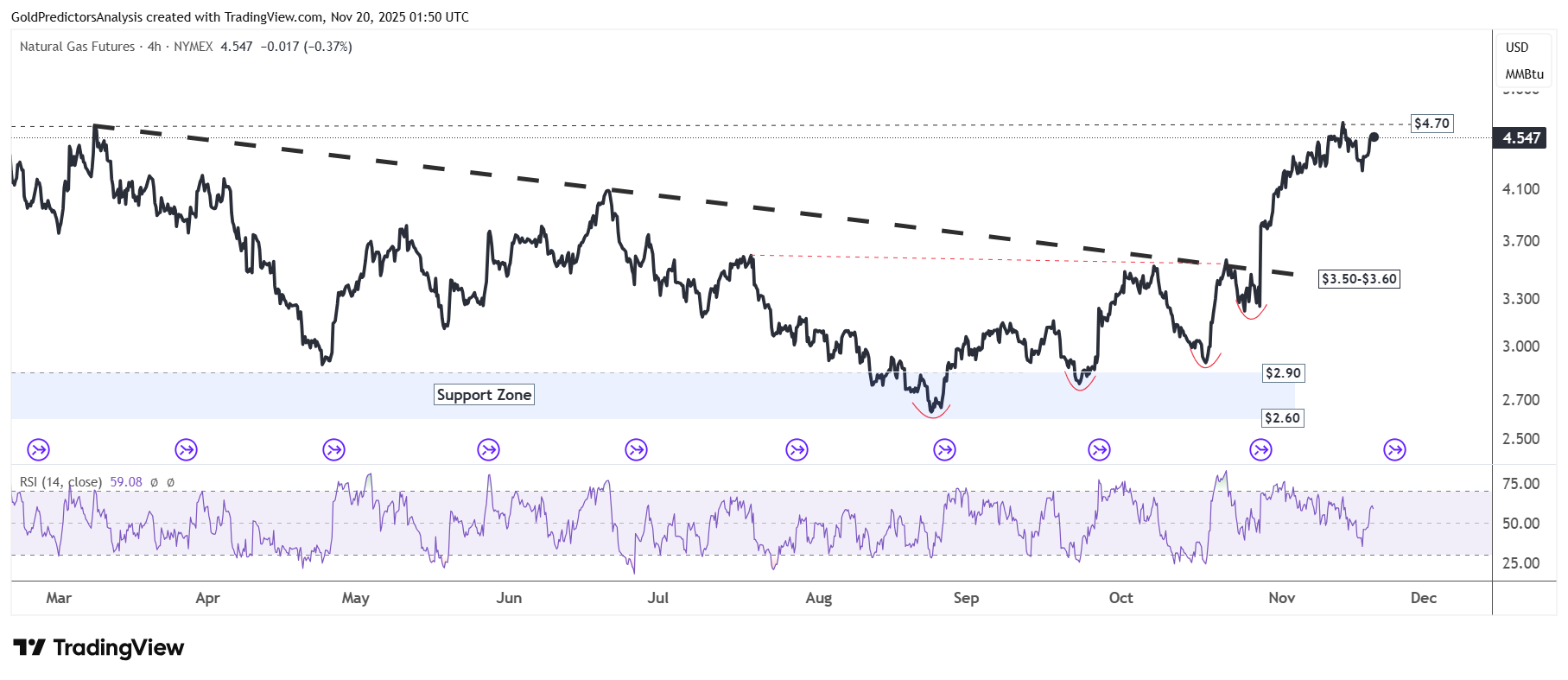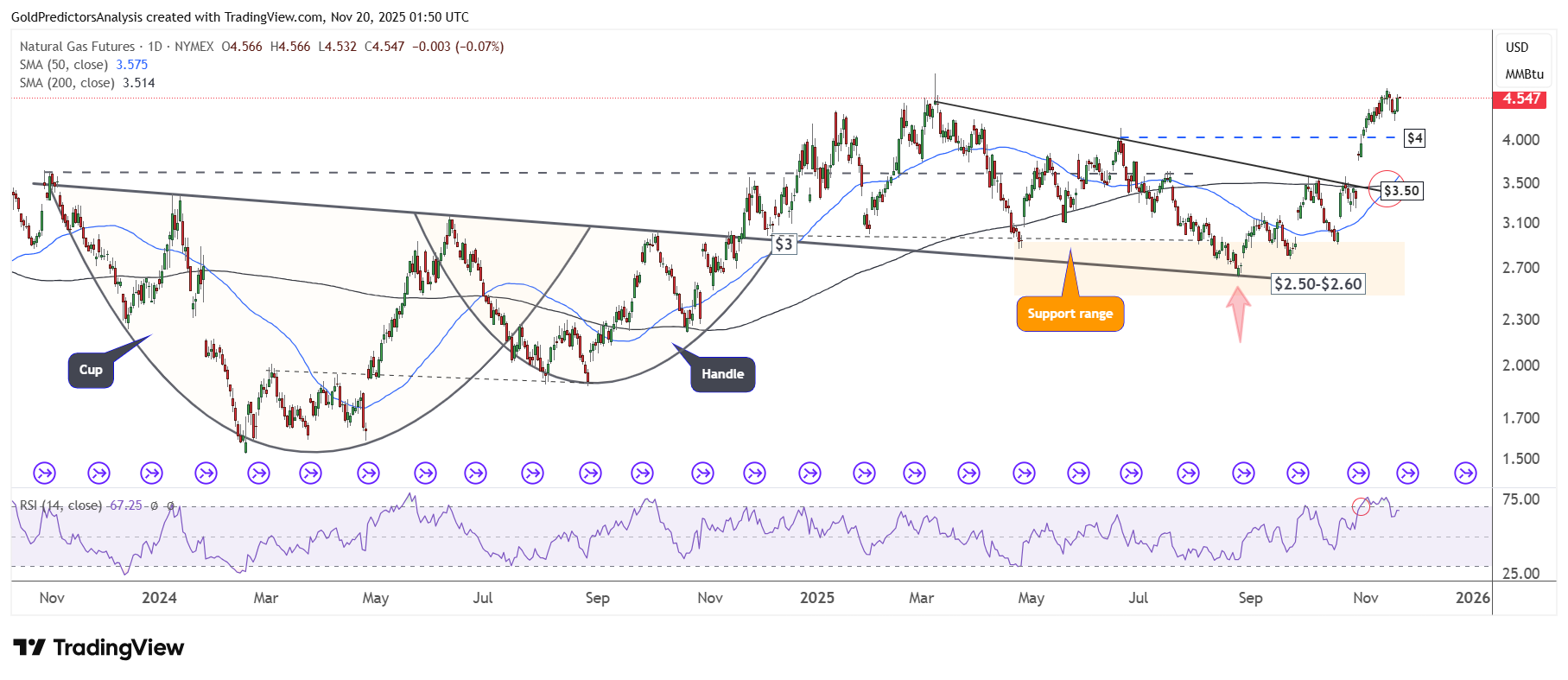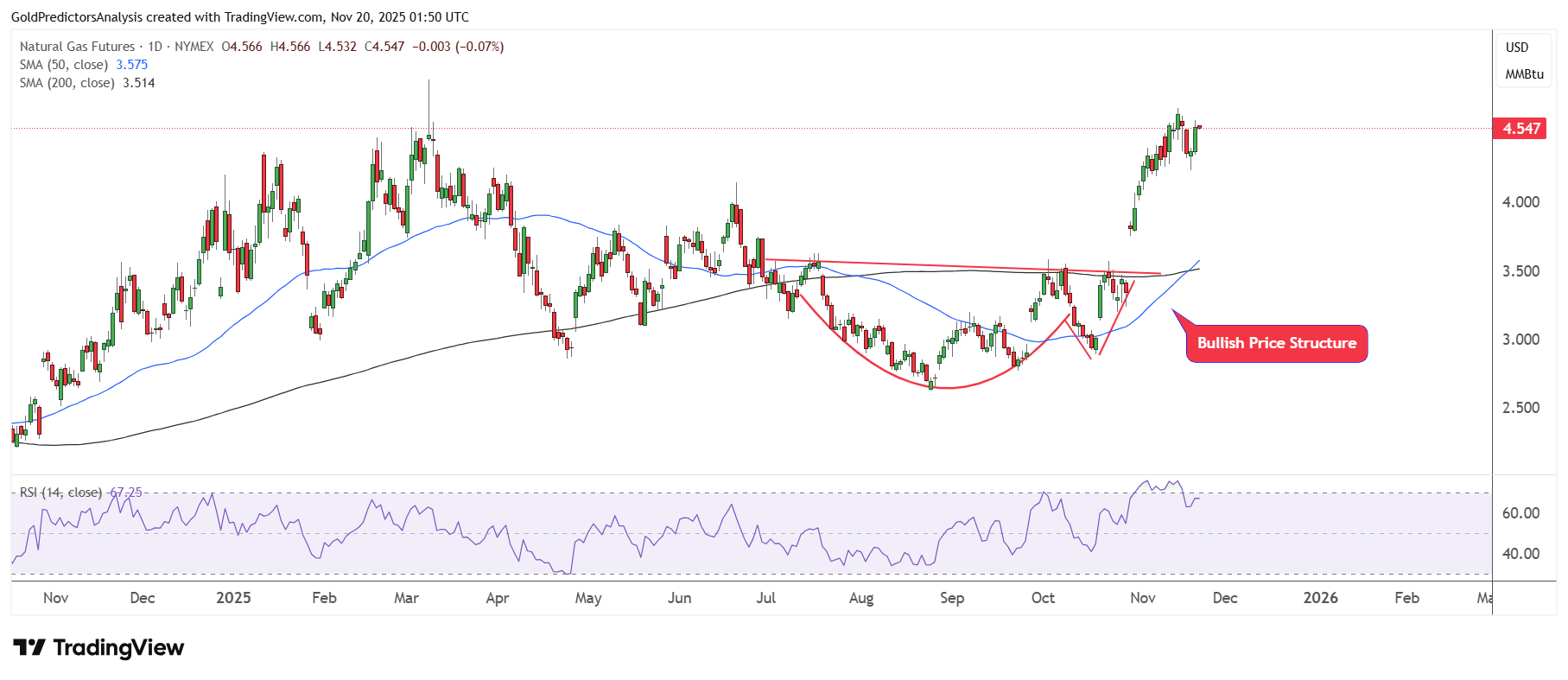 Một biểu đồ ngày khác của khí tự nhiên cho thấy hành động giá tăng mạnh dần hình thành thông qua mô hình đáy tròn dưới vùng 3.50 USD. Khi giá phá vỡ lên trên 3.50 USD và đường trung bình động 200 ngày (SMA), động lực tăng được củng cố. Đường trung bình động 50 ngày hiện đang cắt lên trên đường trung bình động 200 ngày, xác nhận sự phục hồi mạnh mẽ của giá.