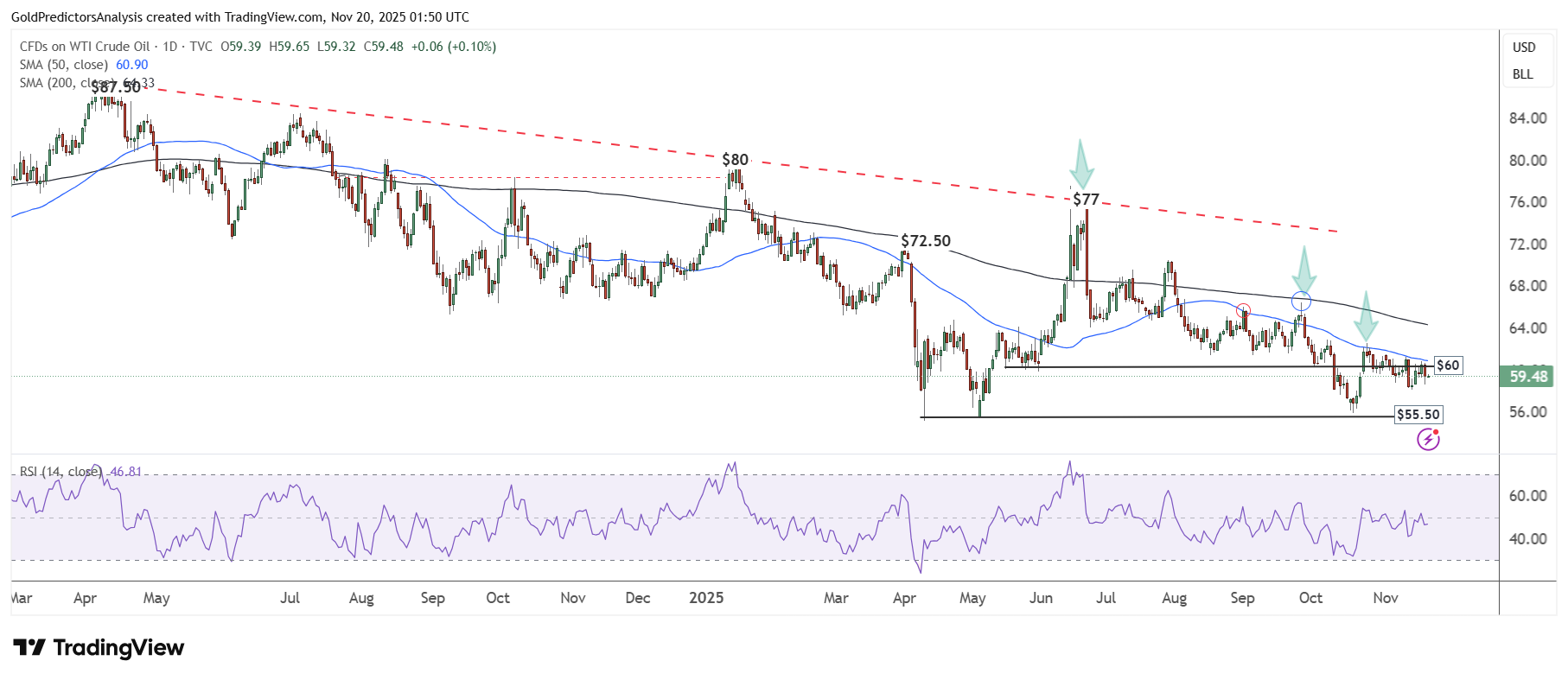 Biểu đồ ngày của dầu thô WTI (CL) cho thấy giá đang củng cố dưới đường trung bình động 50 và 200 ngày (SMA), phản ánh hành động giá tiêu cực. Việc củng cố gần đây quanh khu vực 60 USD làm gia tăng sự bất định về nhịp tiếp theo. Một phá vỡ dưới vùng 58 USD có thể đẩy giá về khu vực 55 USD.