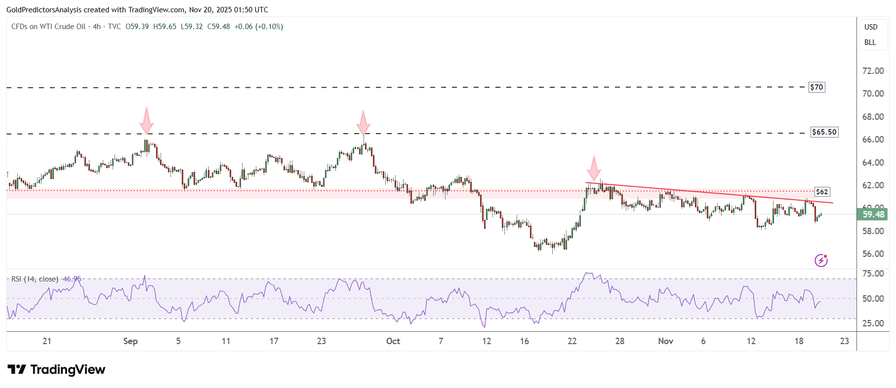 Biểu đồ 4 giờ của dầu thô WTI cho thấy sự củng cố dưới mốc 62 USD, với nhiều nỗ lực bất thành trong việc phá vỡ lên trên. Hành động giá vẫn thiên hướng giảm, được nhấn mạnh bởi đường xu hướng giảm màu đỏ.