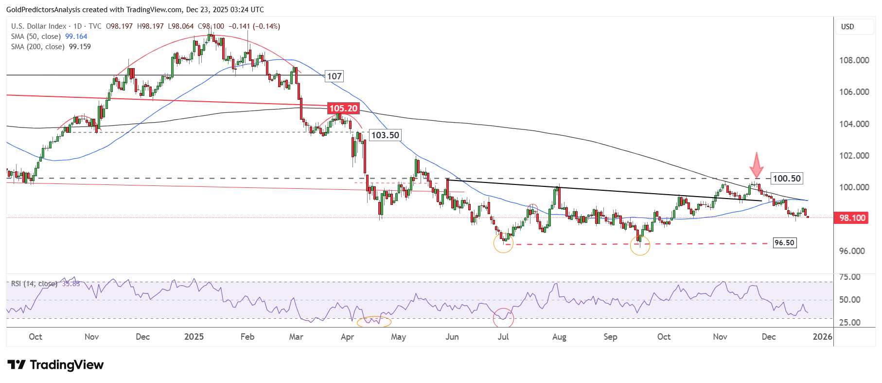 Biểu đồ khung ngày của Chỉ số USD cho thấy chỉ số tiếp tục chịu áp lực bearish khi giao dịch dưới cả đường trung bình động 50 ngày và 200 ngày, đồng thời đang tiến gần mốc 98.00. Một cú phá vỡ xuống dưới 98.00 nhiều khả năng sẽ kích hoạt nhịp giảm đáng kể về vùng 96.50.