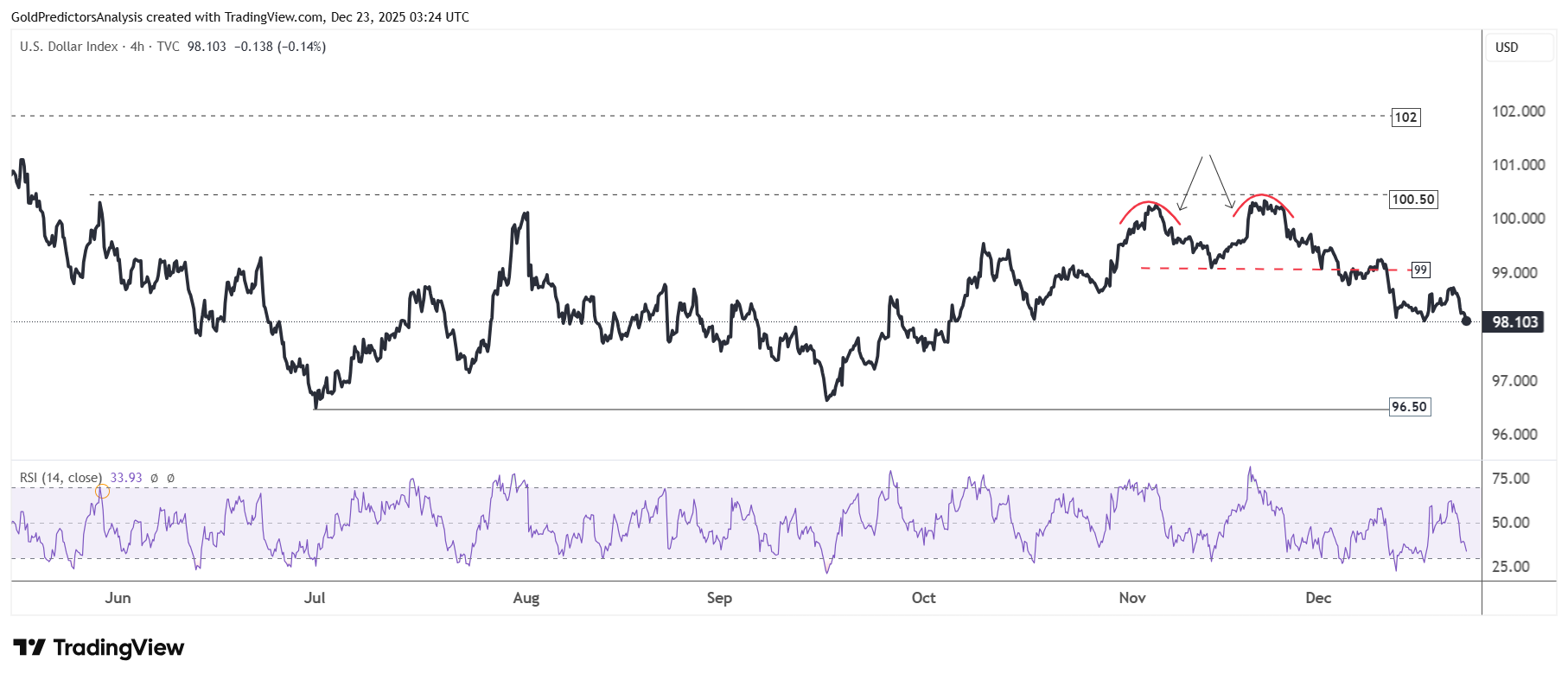 Biểu đồ khung 4 giờ của Chỉ số USD cho thấy sự hình thành mô hình hai đỉnh quanh vùng kháng cự 100.50, trong bối cảnh chỉ số tiếp tục xu hướng đi xuống. Vùng hỗ trợ ngắn hạn gần nhất nằm tại 97.50, và giá hiện đang hướng tới việc giá kiểm định mốc 96.50 trong những ngày tới.