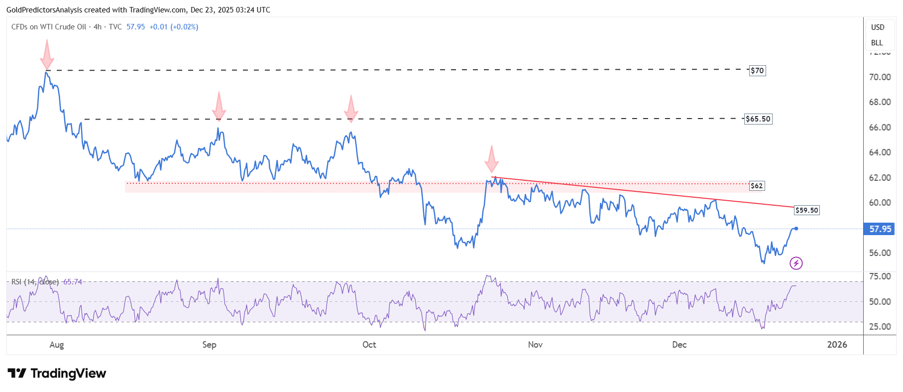 Biểu đồ khung 4 giờ của dầu thô WTI nhấn mạnh vùng kháng cự trước mắt tại 59.50 USD, được củng cố bởi đường xu hướng giảm (màu đỏ) kéo từ đỉnh ngày 24 tháng 10. Khi giá vẫn duy trì dưới 62 USD, động lượng bearish nhiều khả năng sẽ tiếp diễn. Việc giá phá vỡ xuống dưới 55 USD sẽ xác nhận áp lực bán mới và có thể kích hoạt một đợt suy giảm đáng kể của giá dầu.