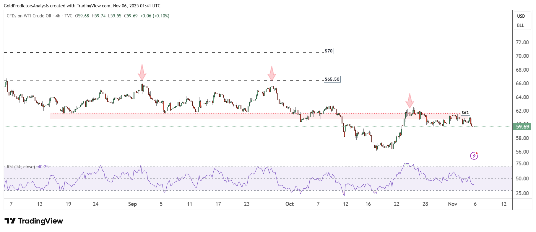 Biểu đồ 4 giờ cho thấy giá tiếp tục giảm sau khi củng cố dưới 62 USD. RSI duy trì dưới đường giữa, nhấn mạnh xu hướng giảm còn tiếp diễn. Miễn là WTI chưa vượt 63 USD, đà giảm vẫn chi phối thị trường.