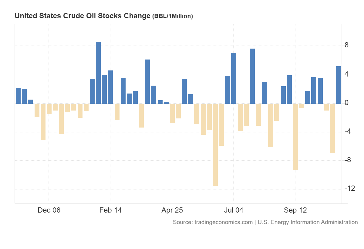 Tuy nhiên, đà giảm được hạn chế nhờ nhu cầu xăng mạnh tại Mỹ. Tồn kho xăng giảm 4.7 triệu thùng, phản ánh mức tiêu thụ vững chắc bất chấp giá giảm. Điều này hỗ trợ biên lợi nhuận sản phẩm tinh chế, cho thấy nền tảng nhu cầu nhiên liệu vẫn ổn định. Thị trường đang cân bằng giữa tín hiệu cung tăng và nhu cầu tích cực, ngăn chặn đà giảm sâu hơn.