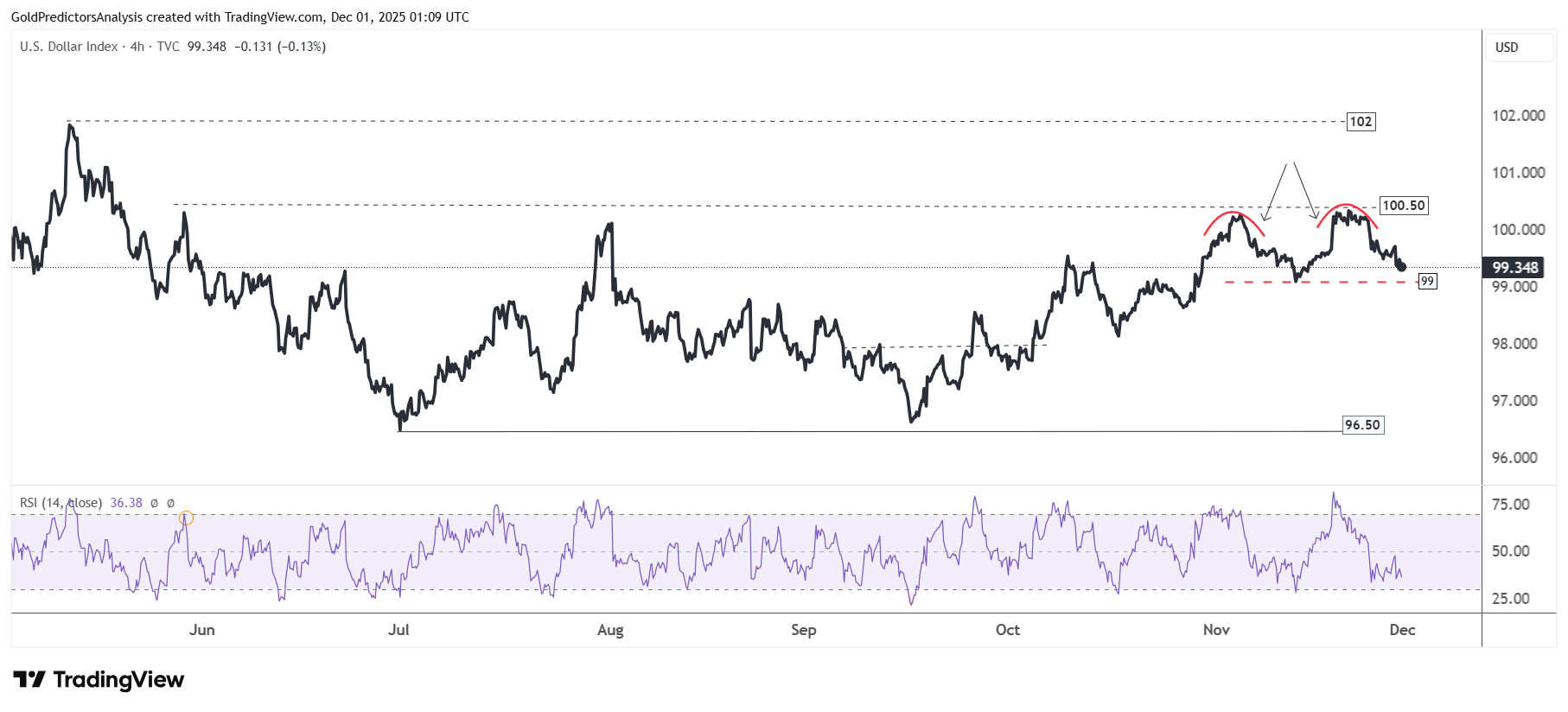 Biểu đồ khung 4 giờ cho thấy mô hình hai đỉnh đang hình thành quanh 100.50. Việc phá vỡ dưới 99 sẽ xác nhận mô hình và có thể kéo giá xuống 98. Nếu tiếp tục phá vỡ dưới 98, áp lực bán có thể tăng thêm và đẩy chỉ số về 96.50.