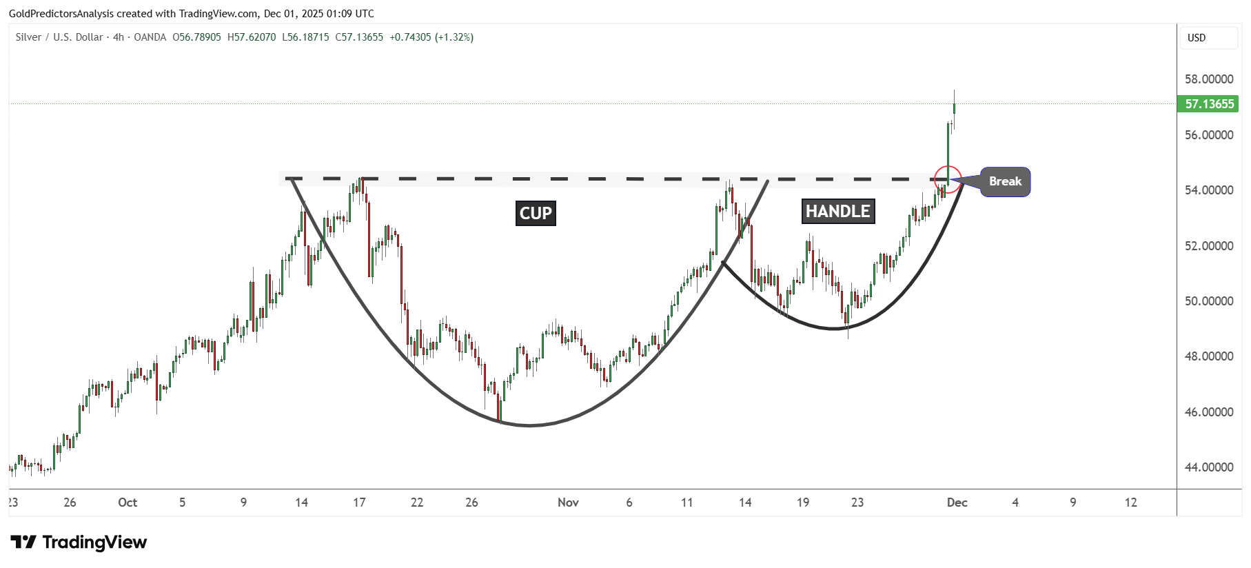 Biểu đồ khung 4 giờ XAGUSD – Mô hình cốc và tay cầm