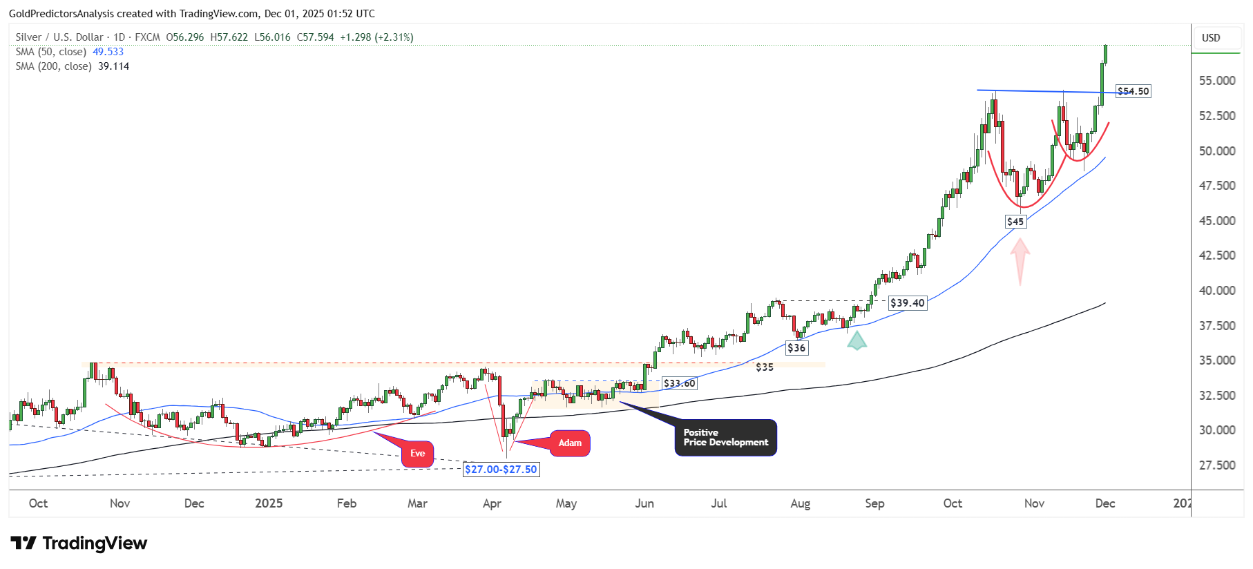 Biểu đồ khung ngày của bạc giao ngay cho thấy mô hình cốc và tay cầm đã hình thành. Giá đã vượt đường cổ tại 54.50 USD, qua đó tạo động lực tăng mới với mục tiêu hướng lên vùng 60 USD. Sự xuất hiện của mô hình Adam và Eve cùng các cú phá vỡ liên tiếp tại nhiều ngưỡng quan trọng tiếp tục củng cố xu hướng tăng của thị trường bạc.