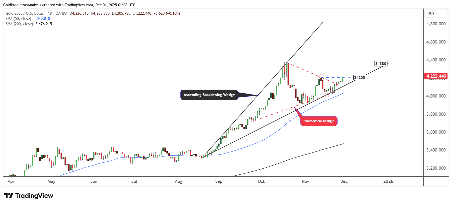 Biểu đồ khung ngày của vàng giao ngay cho thấy giá đã vượt vùng 4,200 USD và đang hướng về kháng cự 4,380 USD. Chừng nào giá vẫn duy trì trong mô hình nêm mở rộng tăng, động lực tăng có thể tiếp tục hướng lên vùng 5,000 USD trong điều kiện biến động mạnh. Việc phá vỡ khỏi mô hình tam giác cân cũng gia tăng áp lực mua trên thị trường vàng.