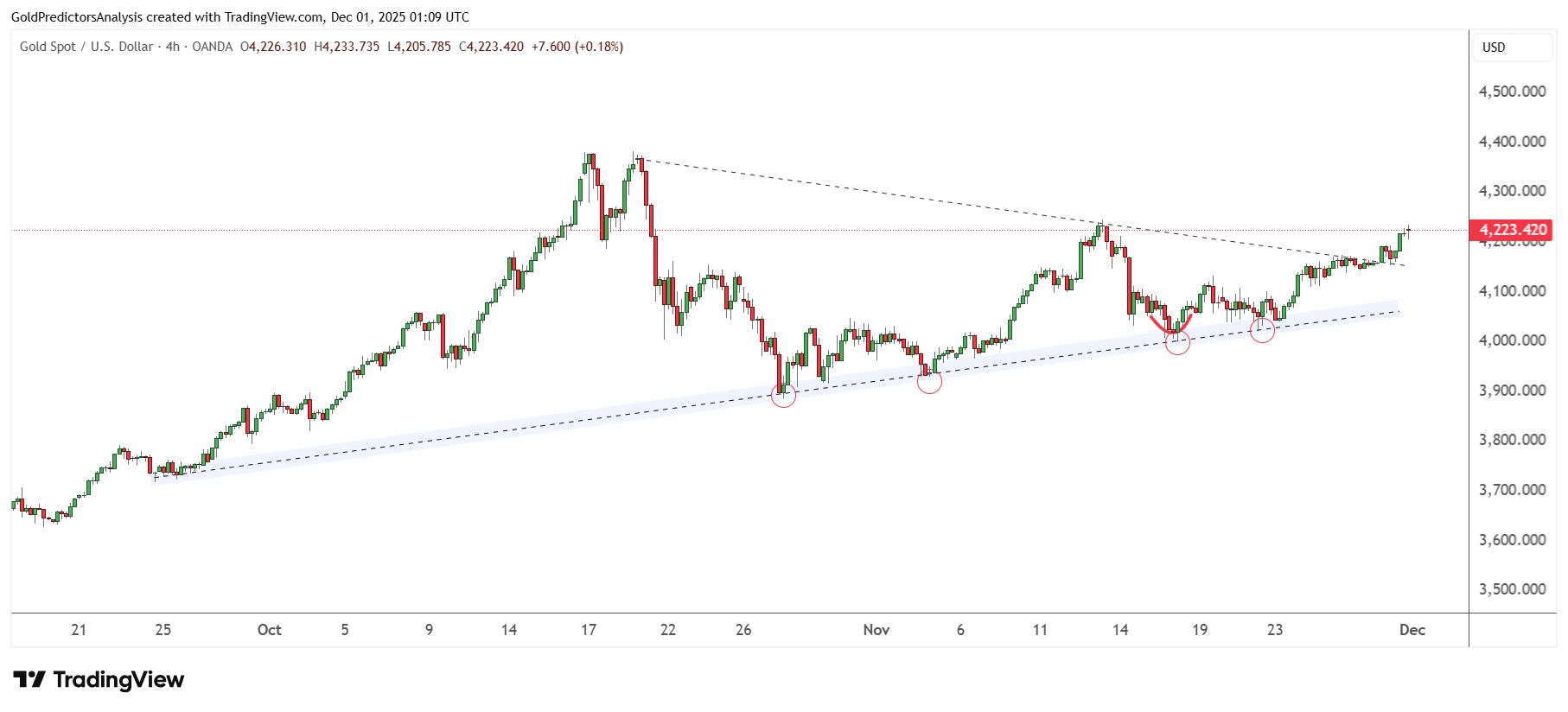 Biểu đồ khung 4 giờ cho thấy giá đang kiểm định vùng kháng cự 4,250 USD. Nếu phá vỡ trên mức này, áp lực mua mới nhiều khả năng sẽ được kích hoạt.