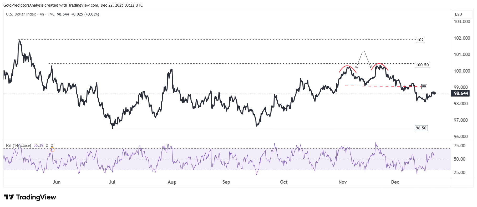 Trên biểu đồ khung 4 giờ, Chỉ số đồng USD cho thấy dấu hiệu hình thành mô hình hai đỉnh quanh mốc 100.50. Việc tiếp tục bị từ chối tại vùng kháng cự 99 có thể duy trì áp lực giảm trong thời gian tới.