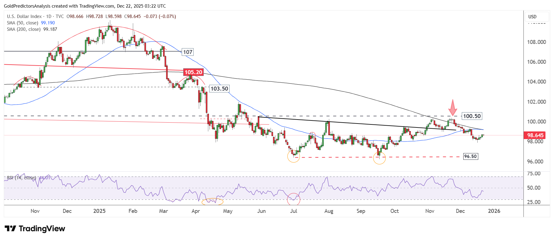 Biểu đồ khung ngày của Chỉ số đồng USD (DXY) cho thấy chỉ số đang tích lũy bên dưới đường trung bình động đơn giản 200 ngày. Giá hiện phục hồi từ vùng hỗ trợ quan trọng quanh 98, nhưng vẫn đối mặt với lực cản mạnh gần đường trung bình 200 ngày tại khu vực 99.