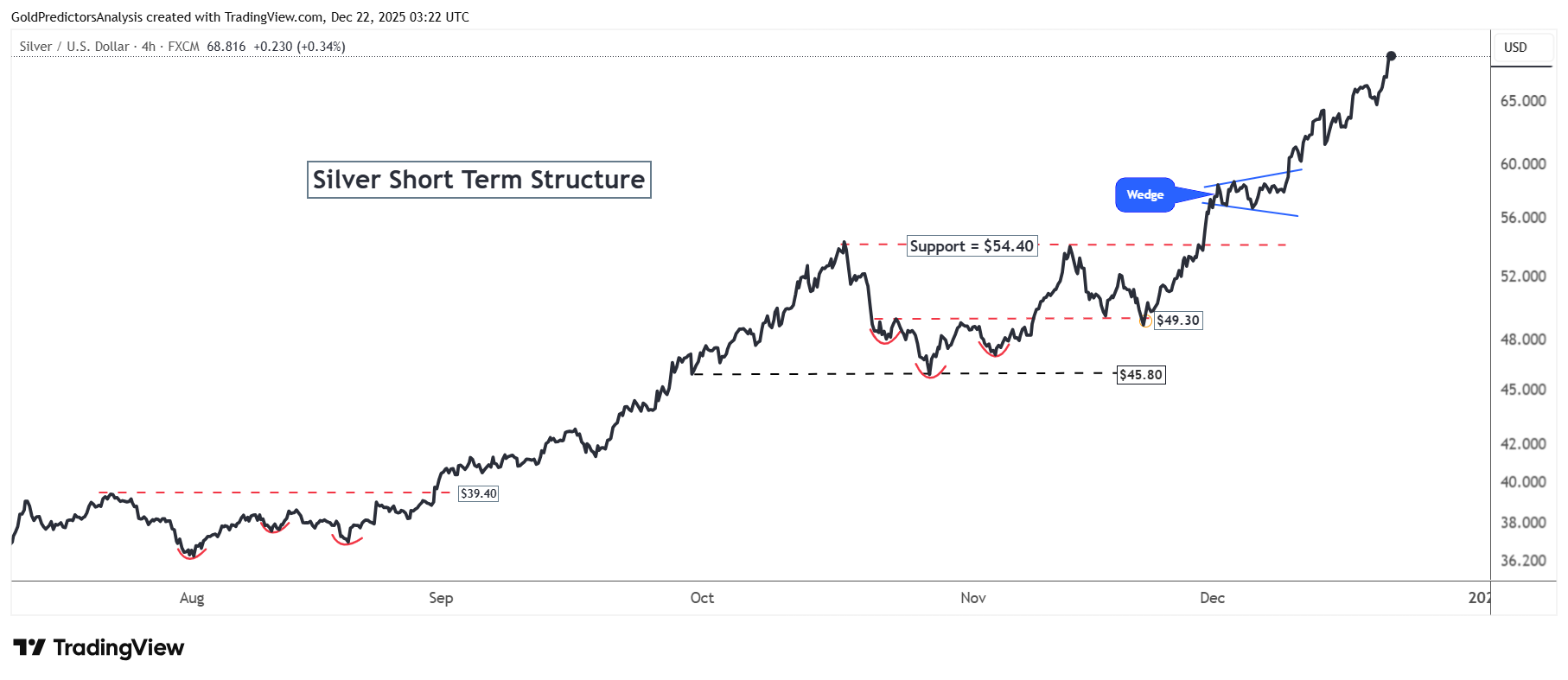 Trong khung 4 giờ, hành động giá của bạc tiếp tục phản ánh xu hướng tăng, được hỗ trợ bởi các mô hình tăng tiếp diễn. Vùng hỗ trợ gần nhất nằm tại 65 USD, và việc duy trì trên khu vực này có thể mở đường cho đà tăng tiếp theo hướng tới vùng 75 USD.