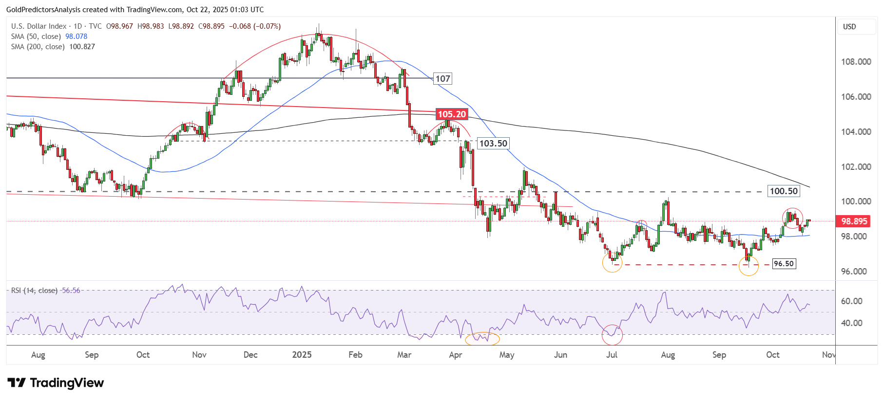 Trên khung ngày, chỉ số USD đang tích lũy trong biên độ 96–100. Mốc 100 đóng vai trò là kháng cự mạnh, trùng với đường SMA 200 ngày quanh 100.50. Dù chỉ số đang củng cố trong phạm vi này, xu hướng tổng thể vẫn nghiêng về giảm. Đà phục hồi hiện tại nhiều khả năng sẽ bị giới hạn dưới SMA 200 ngày trước khi xuất hiện nhịp giảm tiếp theo.