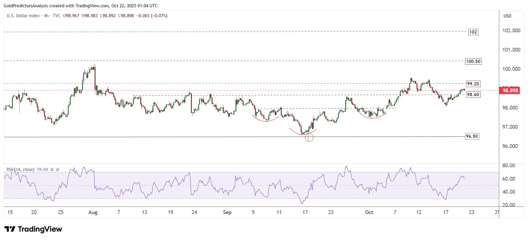 Biểu đồ 4 giờ cho thấy chỉ số USD tiếp tục dao động trong vùng 96–99, nhưng đã bật tăng mạnh từ mức 96 sau loạt đợt cắt giảm lãi suất của Fed. Tuy vậy, cấu trúc giá vẫn thiên về giảm, và quá trình tích lũy hiện tại có khả năng sẽ kết thúc bằng một nhịp điều chỉnh xuống. Nếu vượt 100.50, chỉ số USD có thể mở rộng đà phục hồi lên vùng 102.