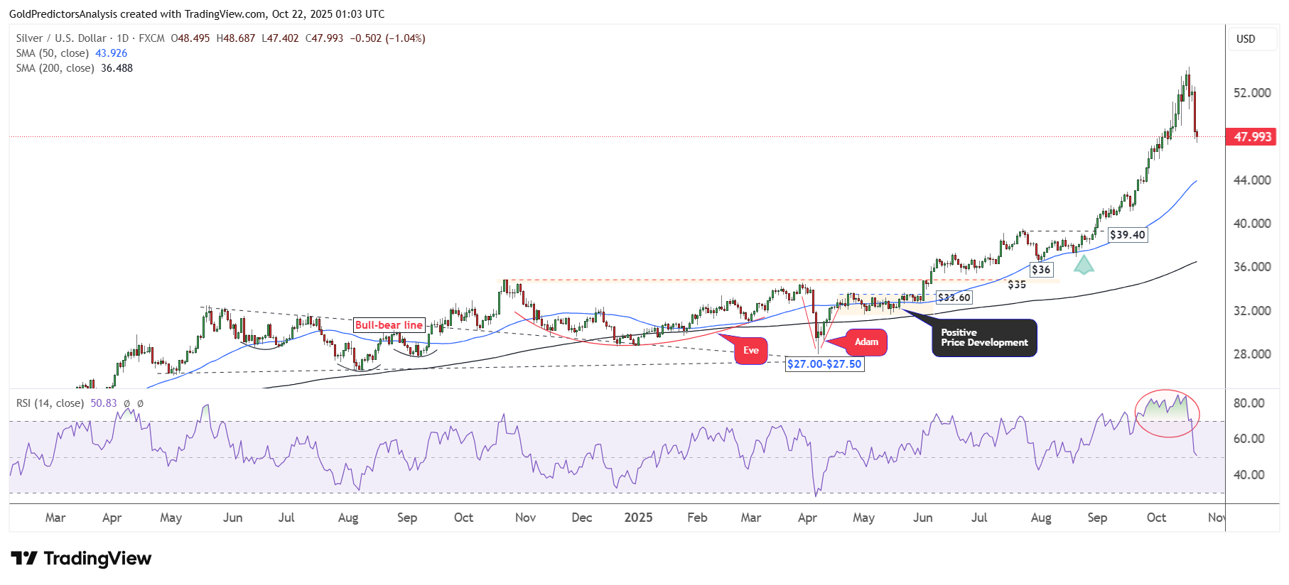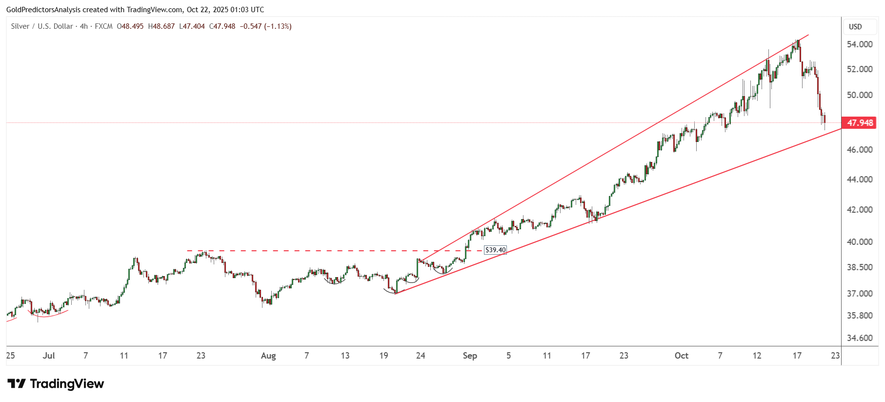 Đợt điều chỉnh từ vùng 54 USD xuống 48 USD cho thấy một nhịp điều chỉnh lành mạnh trong xu hướng tăng dài hạn. Khi RSI ổn định trên vùng 50 hoặc 30, bạc nhiều khả năng sẽ tìm thấy đáy và chuẩn bị cho một đợt phục hồi mới.