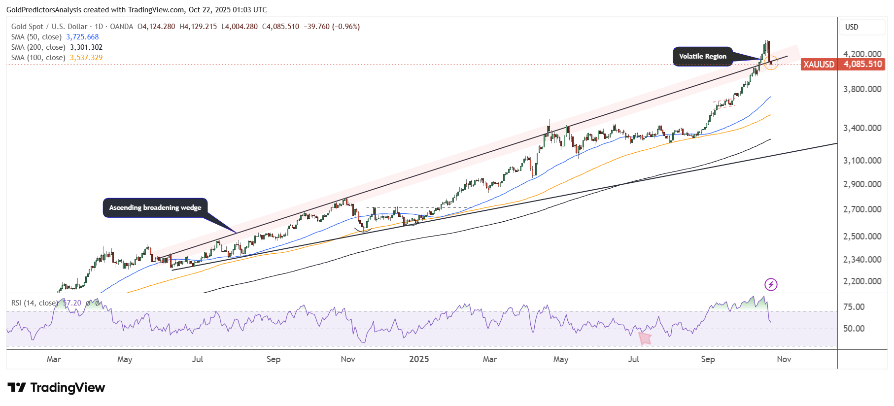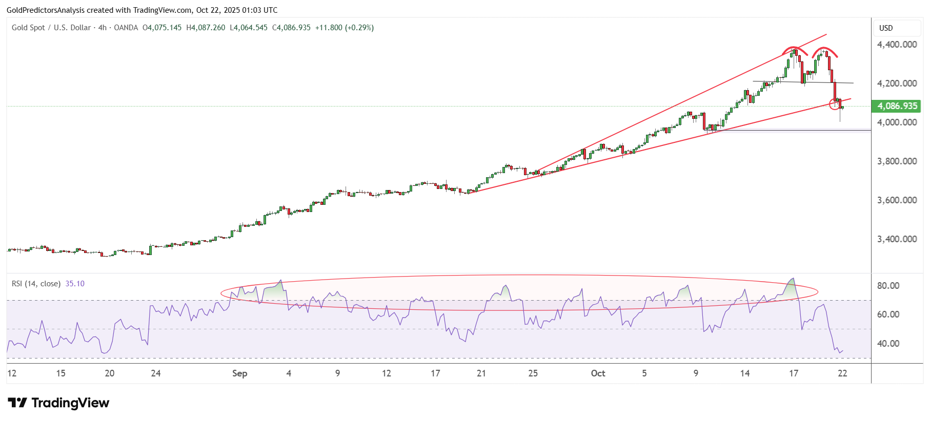 Giá vàng đã giảm từ vùng kháng cự quan trọng khi nhà đầu tư ồ ạt chốt lời sau khi chạm đỉnh lịch sử. Đà giảm này được dự báo trước, như đã đề cập trong bài viết trước. Đây là mức sụt trong ngày mạnh nhất trong 5 năm, được thúc đẩy bởi áp lực bán tháo sau giai đoạn tăng kéo dài. Vàng trước đó tăng nhờ nhu cầu trú ẩn an toàn, hoạt động mua vào của ngân hàng trung ương và kỳ vọng Fed cắt giảm lãi suất, song biến động mạnh quanh đỉnh cho thấy xu hướng tăng đã tạm thời cạn lực.