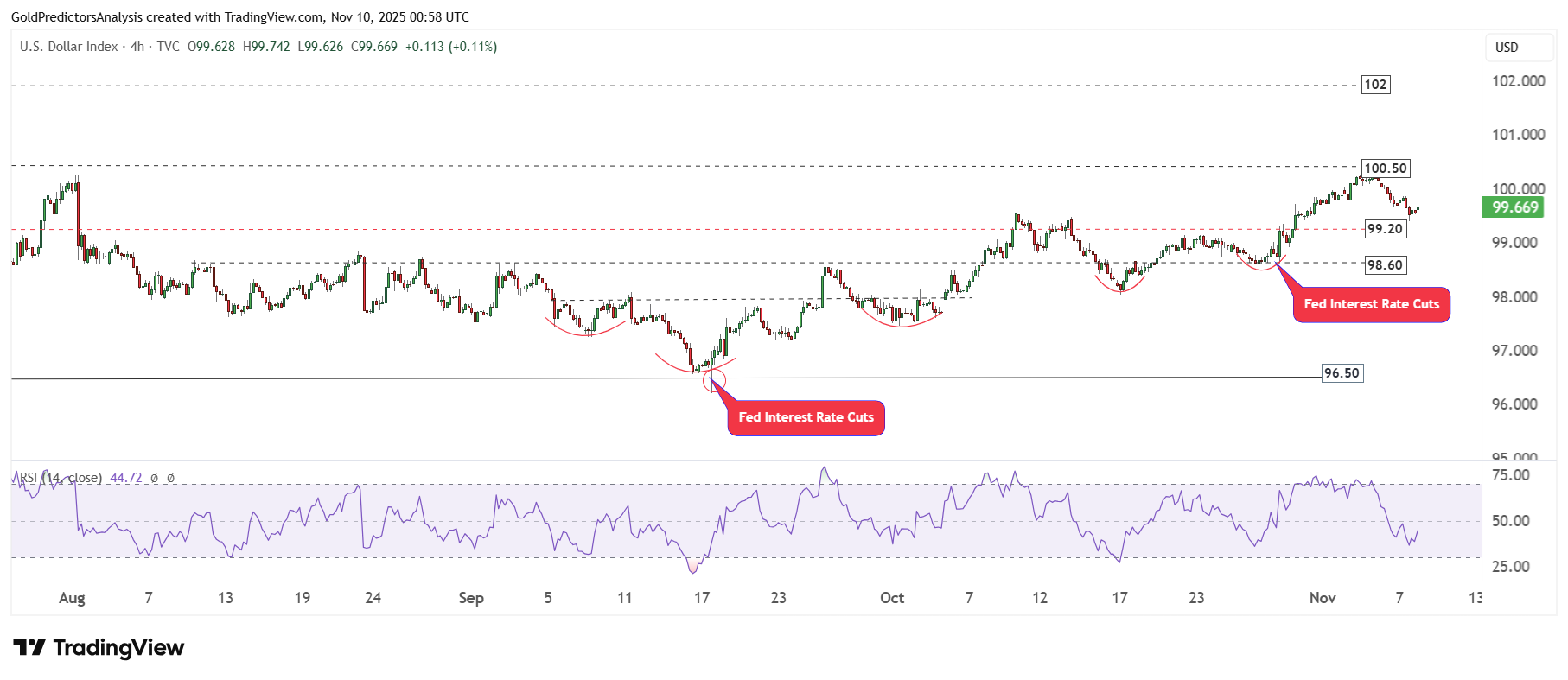 Trên khung 4 giờ, DXY đang dao động tích cực trong phạm vi 96.50–100.50. Một pha phá vỡ xuống dưới 99.20 USD có thể mở rộng đà giảm về 98.60 USD, và nếu mất mốc 98.60 USD, xu hướng giảm có thể kéo dài về vùng 96.50 USD.