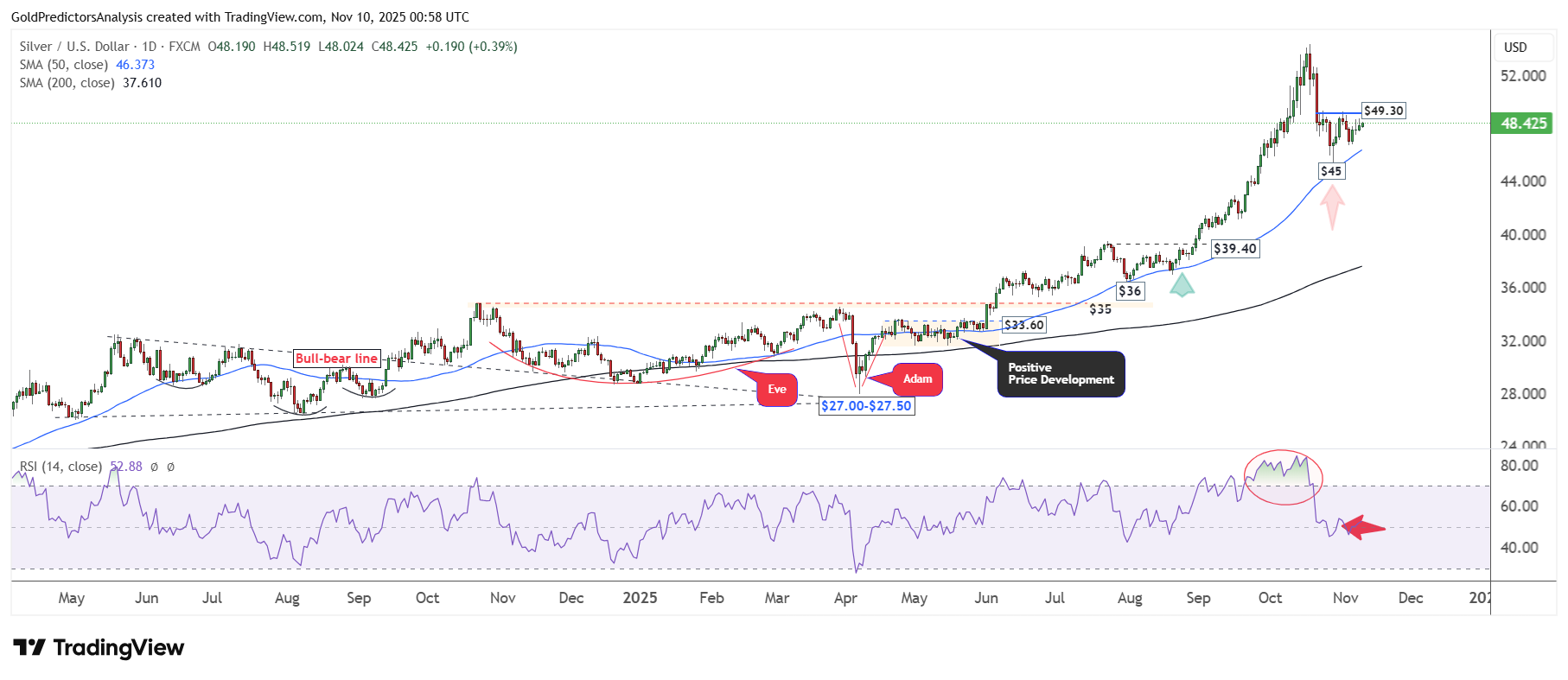 Trên khung ngày, giá bạc giao ngay nhận được hỗ trợ mạnh quanh vùng 45 USD, trùng với đường SMA 50 ngày, trong khi giá đang củng cố bên dưới ngưỡng kháng cự quan trọng 49.30 USD. Nếu giá bứt phá qua 49.30 USD, đà tăng có thể mở rộng về vùng 52 USD. Ngược lại, nếu thủng 45 USD, giá có thể điều chỉnh sâu hơn về vùng 42 USD. RSI cho thấy trạng thái quá mua đang hạ nhiệt, báo hiệu giai đoạn điều chỉnh ngắn trước khi có thể tiếp tục tăng.