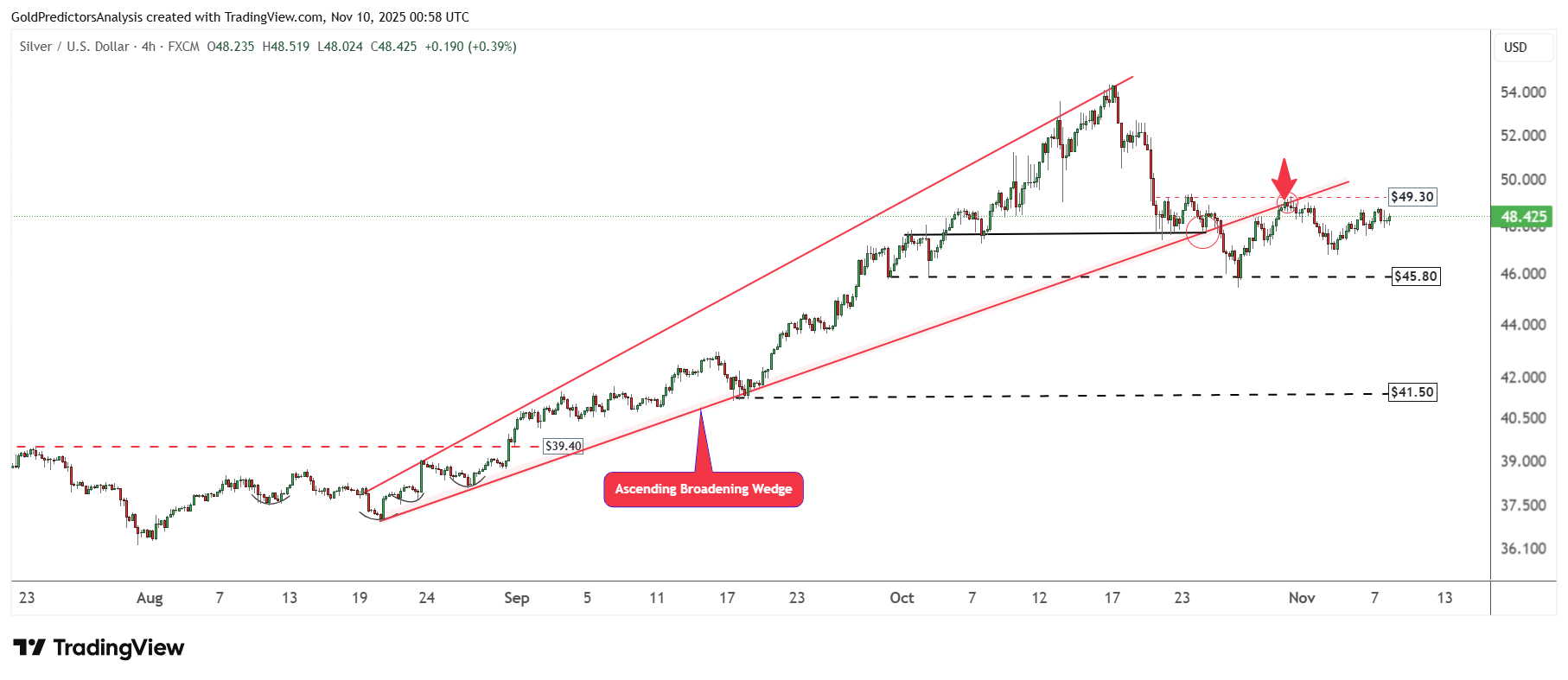 Trên khung 4 giờ, bạc giao ngay đã phá xuống khỏi mô hình nêm mở rộng tăng dần và đang kiểm tra lại vùng phá vỡ quanh 49.30 USD. Sự củng cố kéo dài dưới ngưỡng này làm gia tăng độ bất định, khi giá vẫn chưa xác định được hướng đi rõ ràng. Một pha giảm xuống dưới 45.80 USD có thể kích hoạt đà giảm mạnh hơn về vùng 41.50 USD, trong khi một phá vỡ trên 49.30 USD sẽ xác nhận đà tăng tiếp tục, hướng tới vùng 52–53 USD.