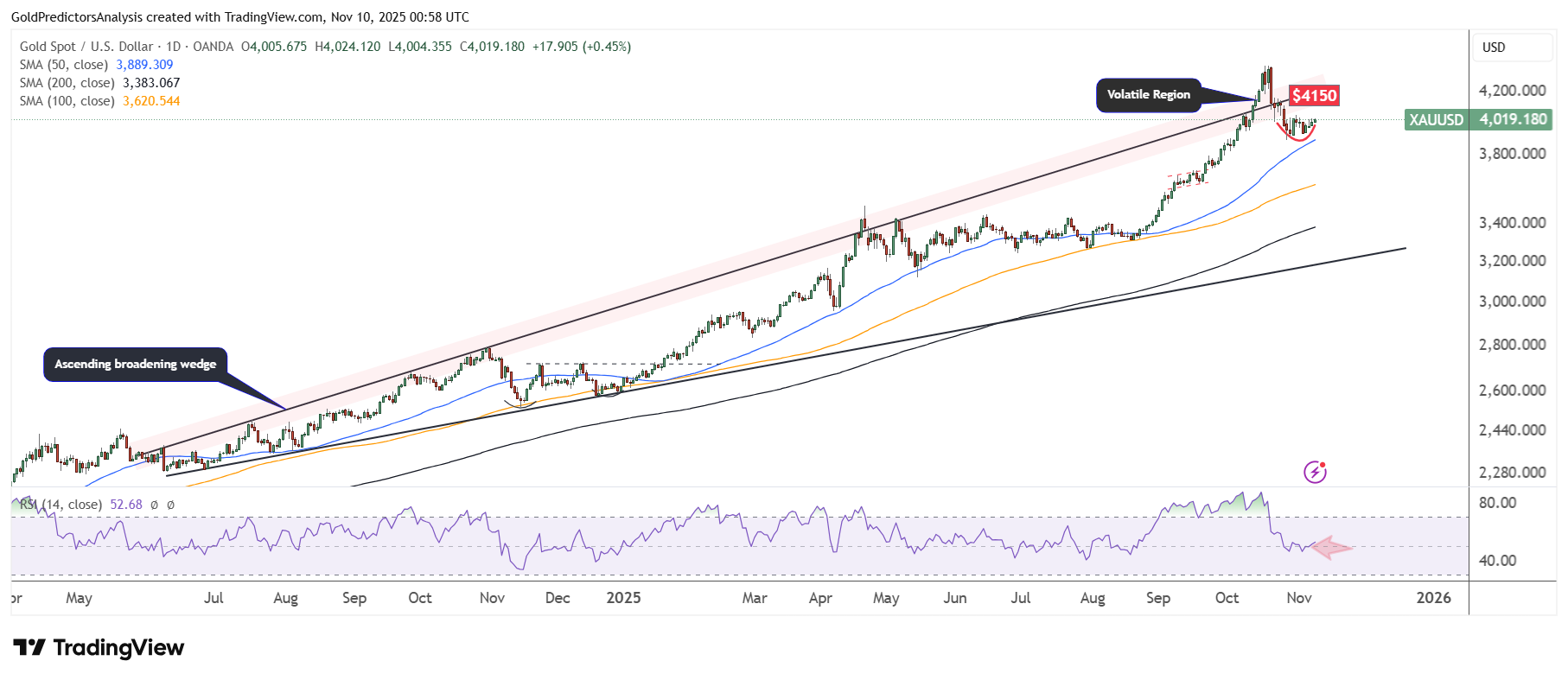 Trên khung ngày, giá vàng giao ngay đã điều chỉnh trở lại sau khi bứt phá ngắn hạn vượt vùng kháng cự mạnh quanh 4,200 USD. Đợt mở rộng này kéo giá quay lại vùng 4,000 USD, nơi giá hiện đang củng cố và có khả năng hình thành một vùng đáy ngắn hạn. Nếu vàng duy trì được trên vùng hỗ trợ 3,900 USD, triển vọng tăng sẽ được củng cố. Một pha phá vỡ rõ ràng trên 4,200 USD có thể xác nhận thêm đà tăng mới. Chỉ báo RSI đang dao động quanh mức trung bình, cho thấy tiềm năng tăng giá vẫn còn.