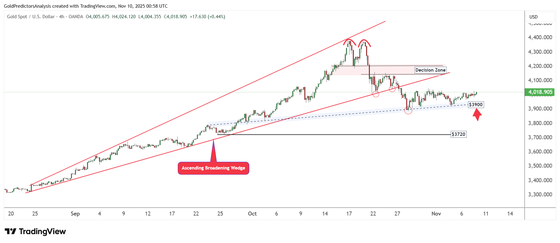 Trên khung 4 giờ, vàng giao ngay đã phá xuống khỏi mô hình nêm mở rộng tăng dần và đang hình thành đáy quanh vùng hỗ trợ 3,900 USD. Hiện giá đang củng cố trên đường xu hướng chấm đen quanh khu vực này. Tuy nhiên, nếu không thể vượt qua vùng 4,050 USD và rơi xuống dưới 3,900 USD, giá có thể tiếp tục giảm, với mục tiêu tiềm năng tại 3,720 USD.