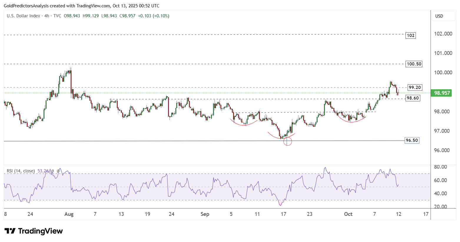 Trên khung 4 giờ, chỉ số USD cho thấy mô hình vai đầu vai ngược hình thành sau khi phục hồi từ 96.50. Chỉ số chạm kháng cự 99.20 rồi điều chỉnh về hỗ trợ 98.60. Diễn biến này phản ánh sự thiếu chắc chắn trong xu hướng ngắn hạn. Miễn là chỉ số còn nằm dưới 100.50, triển vọng tổng thể của USD vẫn mang tính tiêu cực.