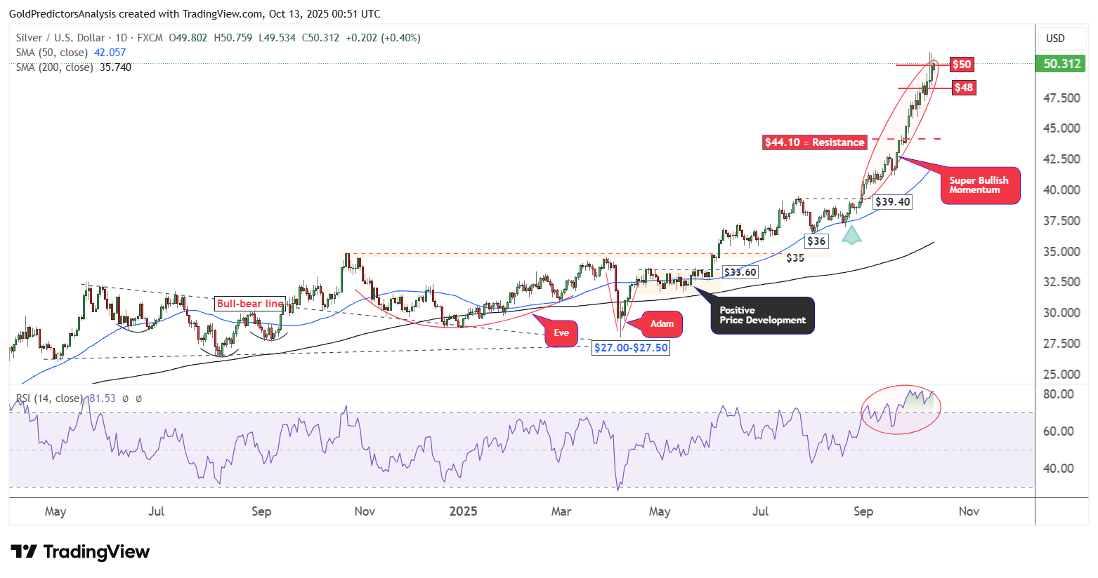 Trên khung ngày, bạc đang đối mặt với vùng kháng cự mạnh trong khu vực 48–50 USD sau đợt tăng mạnh gần đây. Các bóng nến trên dài phản ánh sự do dự của thị trường tại vùng này khi lực mua và bán cạnh tranh quyết liệt. Nếu giá phá vỡ 51 USD, bạc có thể mở rộng đà tăng lên 55 USD. Các mô hình tăng giá và tín hiệu bứt phá liên tục ủng hộ khả năng duy trì xu hướng tăng. Tuy nhiên, RSI đang cho thấy tình trạng mua quá mức cực độ, nên nếu có điều chỉnh, giá có thể giảm đáng kể trước khi phục hồi.