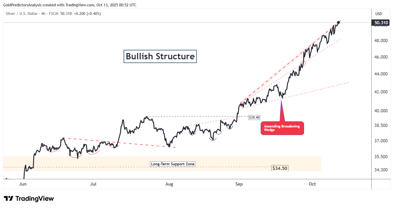 Trên khung 4 giờ, bạc đang tích lũy gần biên trên của mô hình nêm mở rộng quanh 51 USD. Nếu giá không vượt qua được vùng này, một nhịp điều chỉnh sâu về 45 USD có thể xảy ra. Ngược lại, một cú bứt phá dứt khoát trên 51 USD có thể kích hoạt đợt tăng tiếp theo, duy trì cấu trúc parabol tăng giá của bạc.