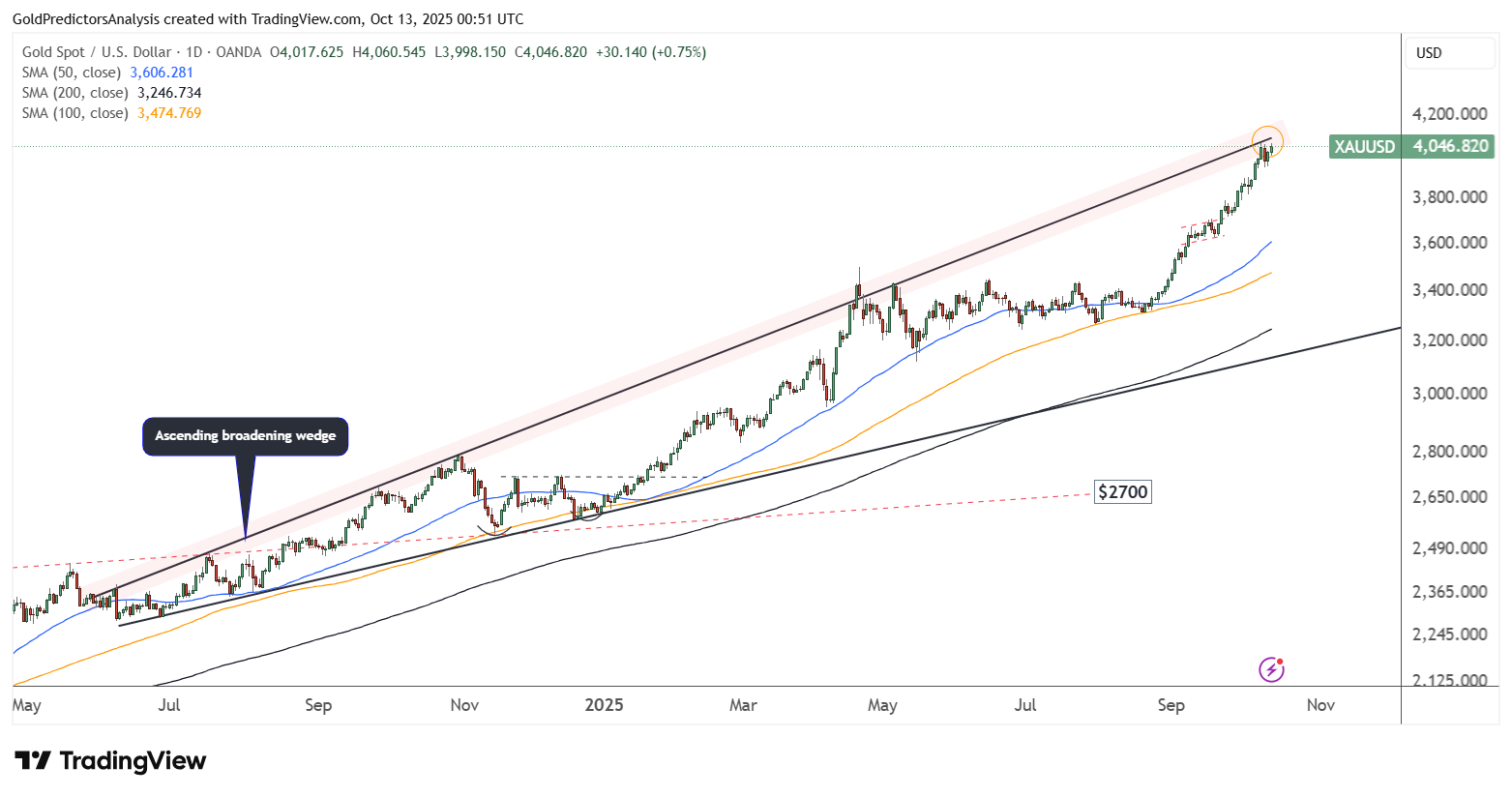 Biểu đồ ngày XAU/USD – Mô hình nêm mở rộng tăng