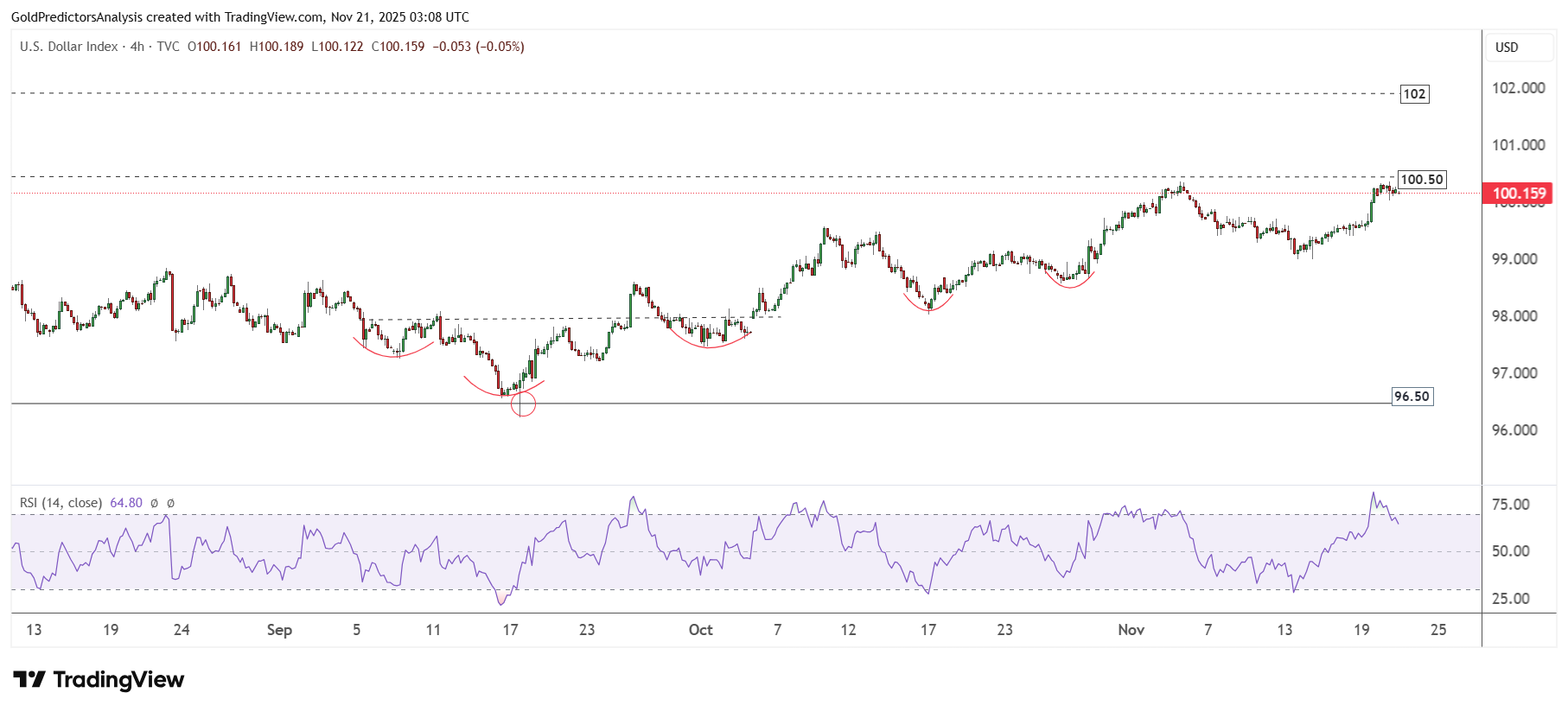 Biểu đồ khung giờ cho thấy chỉ số USD củng cố trong vùng 96.50–100.50. Phá vỡ xuống dưới 96.50 sẽ mở ra nhịp giảm mới, trong khi đột phá lên trên 100.50 có thể đẩy chỉ số tiến về 102.