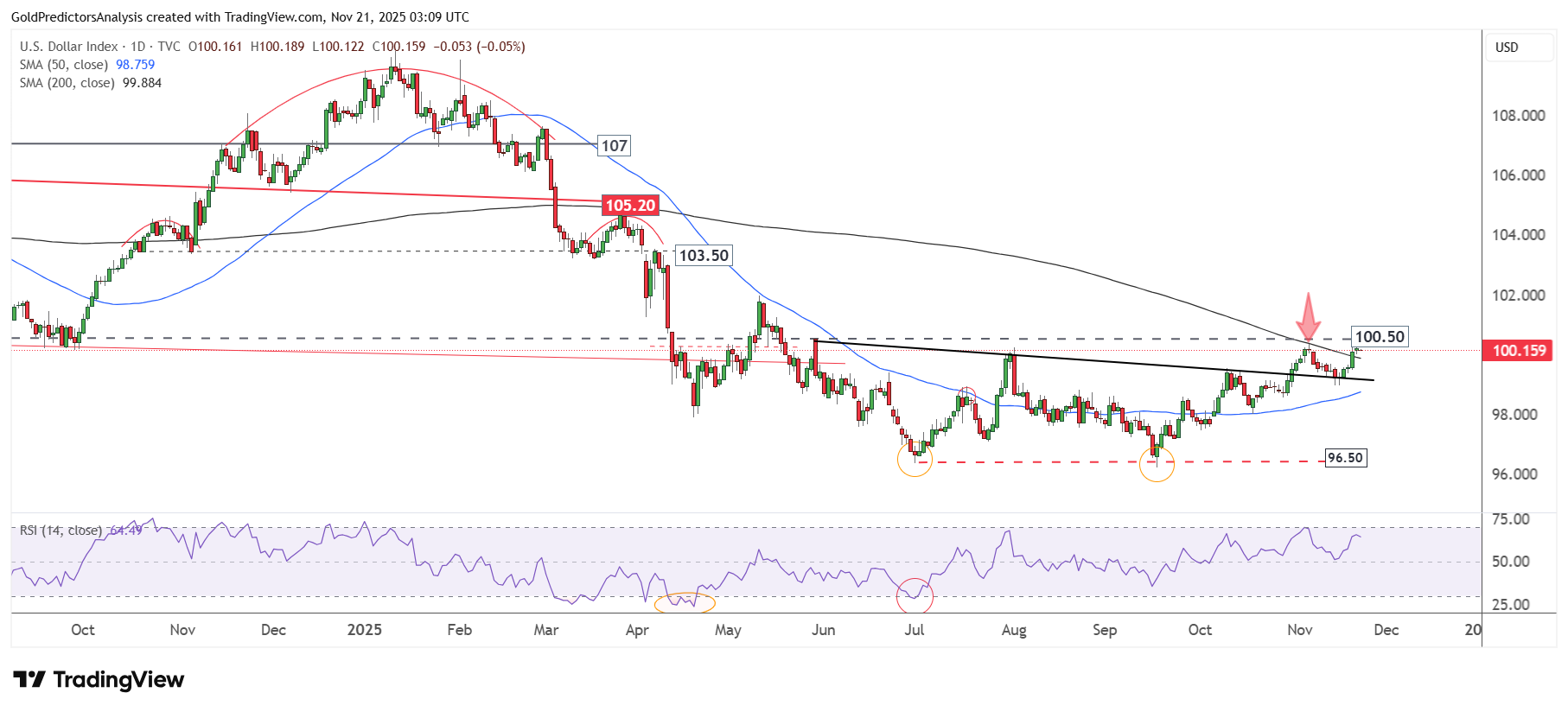 Biểu đồ khung ngày của chỉ số USD cho thấy sự phục hồi từ vùng hỗ trợ dài hạn 96.50. Đột phá lên trên 100.50 có thể đưa chỉ số lên vùng 102, trong khi phá vỡ xuống dưới 96.50 sẽ xác nhận xu hướng giảm tiếp diễn.