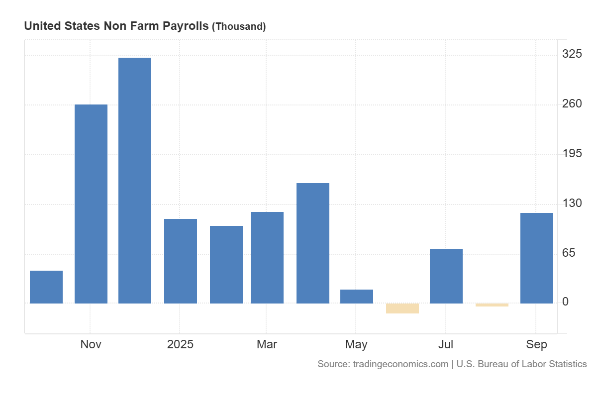 Giá giảm sau khi báo cáo việc làm Mỹ tháng 9 mạnh hơn dự kiến, làm suy yếu hy vọng về việc cắt giảm lãi suất sớm. Bảng lương phi nông nghiệp tăng hơn 119,000 việc làm, gấp đôi mức dự báo, phản ánh sức mạnh bền vững của thị trường lao động. Do đó, các nhà giao dịch điều chỉnh kỳ vọng, đưa xác suất cắt giảm lãi suất tháng 12 xuống còn 35.6%.