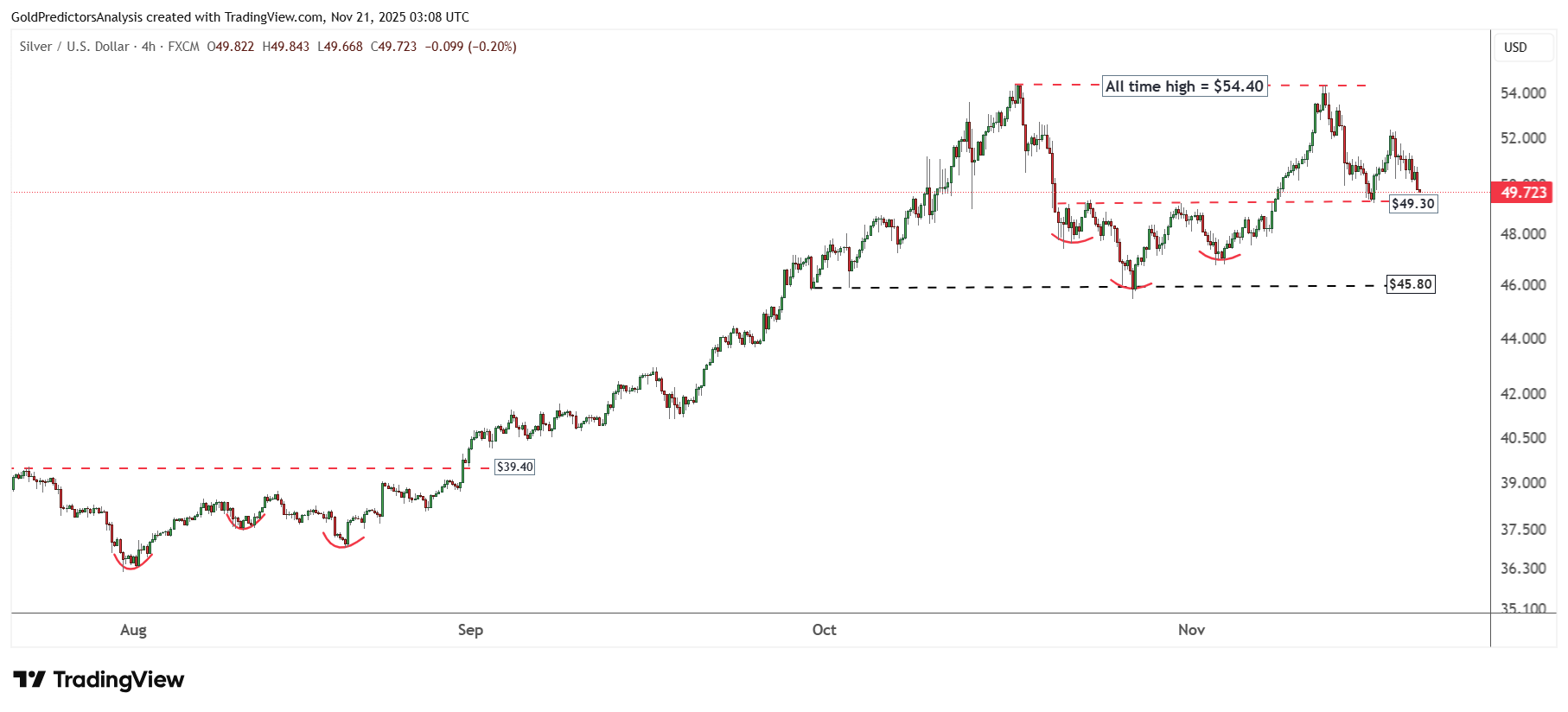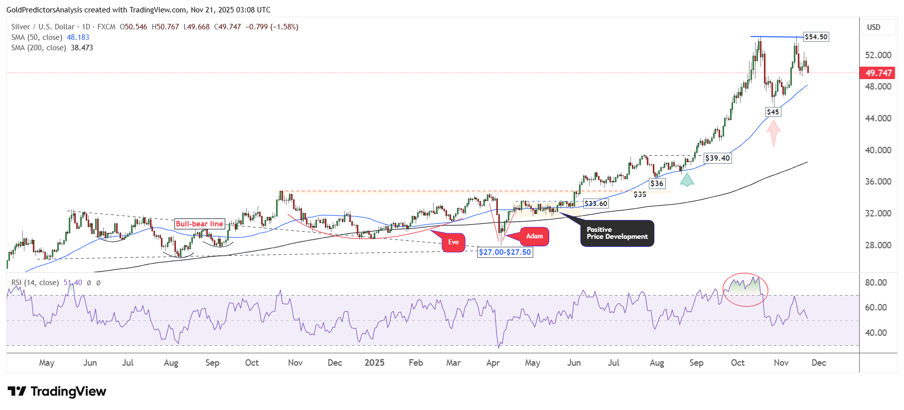 Biểu đồ khung ngày cho thấy bạc đang điều chỉnh giảm từ mức $54.50 sau khi lập đỉnh lịch sử. Tuy vậy, vùng hỗ trợ quanh $49.30 kết hợp với đường SMA 50 ngày đang hướng lên cho thấy động lượng cơ bản vẫn mạnh. Một phá vỡ xuống dưới $45 sẽ xác nhận chuyển hướng giảm và mở ra rủi ro giảm sâu về vùng $40. Ngược lại, đột phá vượt $54.50 sẽ mở ra chu kỳ tăng mạnh mới.