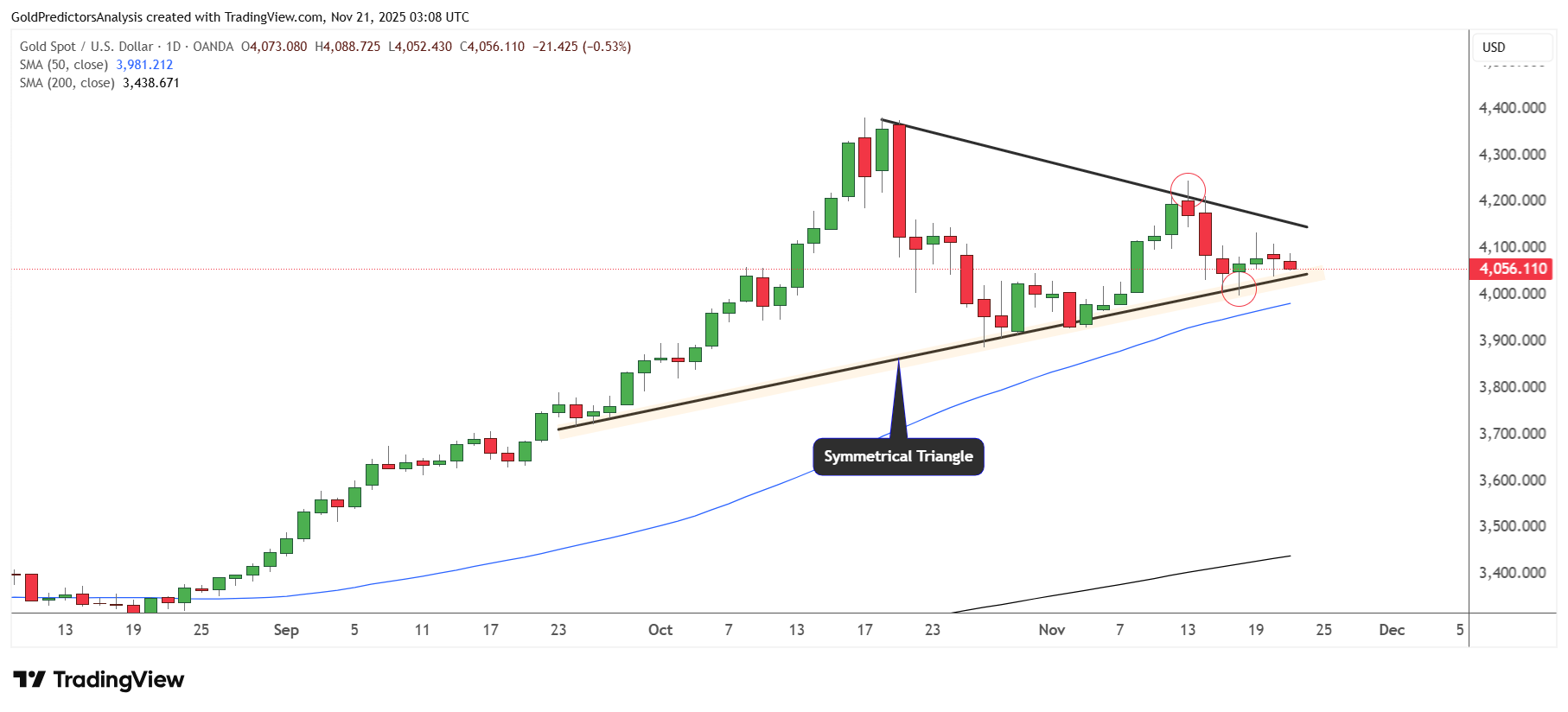 Biểu đồ khung ngày cho thấy giá đang củng cố trong mô hình tam giác cân. Giá vẫn duy trì phía trên đường trung bình động 50 ngày, trong khi cả SMA 50 ngày và SMA 200 ngày đều hướng lên, xác nhận xu hướng tăng mạnh. Tuy vậy, sự củng cố vào thời điểm cuối năm phản ánh yếu tố mùa vụ thường tạo ra mức bất ổn cao hơn.