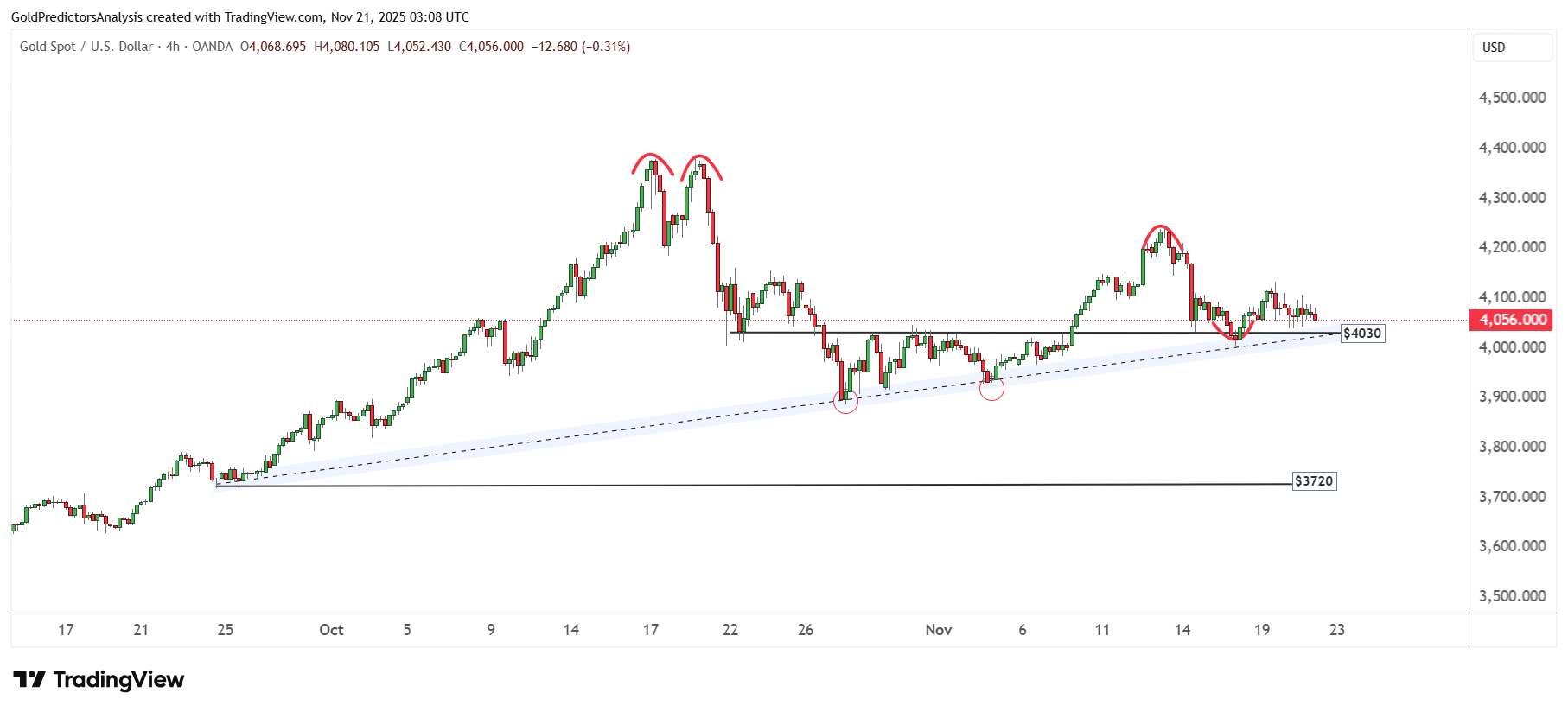 Biểu đồ khung giờ cho thấy vàng củng cố mạnh phía trên vùng $4,030. Giá vẫn nằm trên đường xu hướng chấm đen, duy trì thiên hướng tăng. Tuy nhiên, sự củng cố sau khi điều chỉnh từ đỉnh $4,380 cho thấy mức độ bất ổn tăng lên, đồng thời nâng rủi ro biến động mạnh theo cả hai hướng.