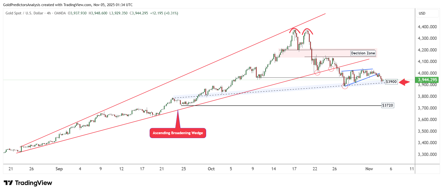 Trên khung 4 giờ, giá vàng đã phá vỡ xuống dưới mô hình nêm mở rộng tăng dần, báo hiệu giai đoạn củng cố rõ rệt. Hiện giá đang dao động quanh vùng hỗ trợ quan trọng 3,900 USD nhưng động lực mua có vẻ yếu. Nếu phá vỡ dưới vùng này, vàng có thể tiếp tục giảm về khu vực hỗ trợ chiến lược 3,720 USD — mức đáy kỹ thuật quan trọng trong trung hạn.