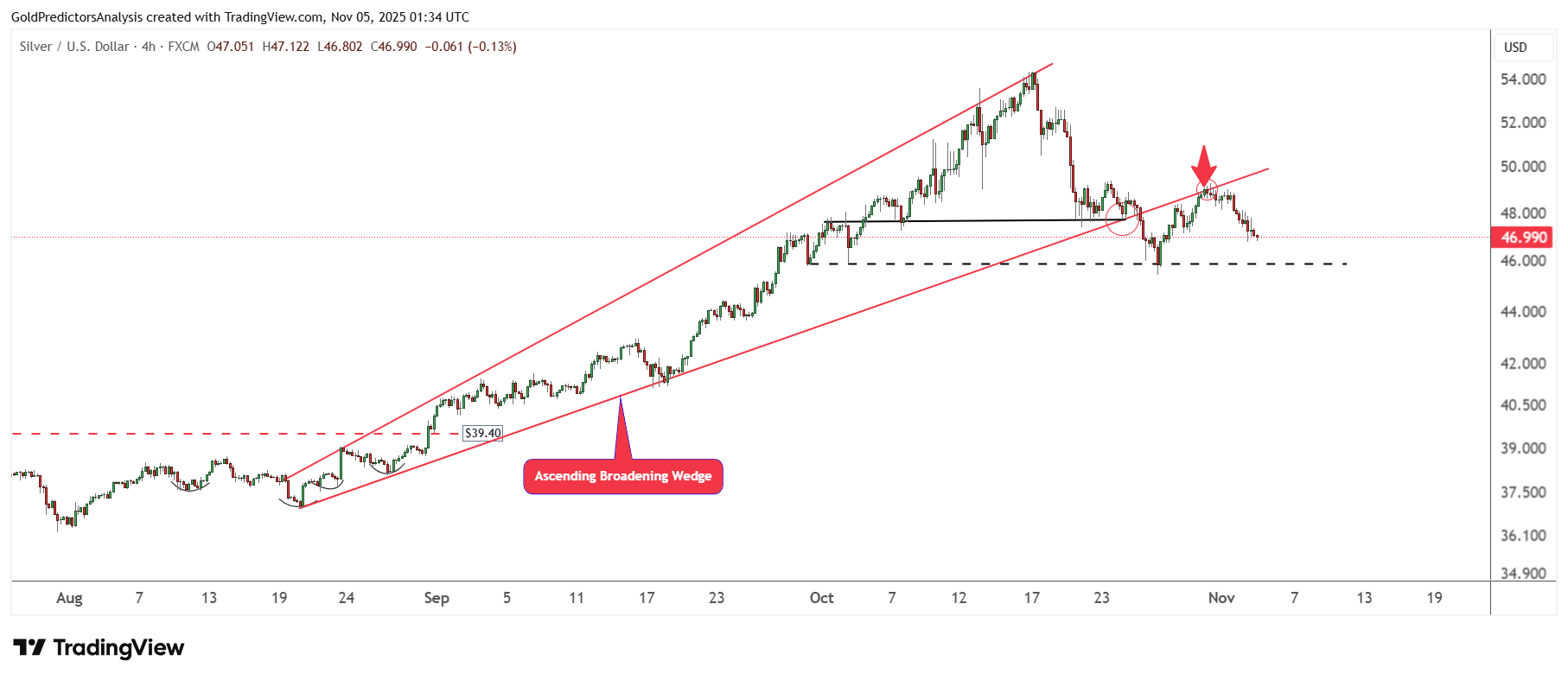 Biểu đồ 4 giờ XAG/USD – Kiểm tra mô hình cái loa tăng
