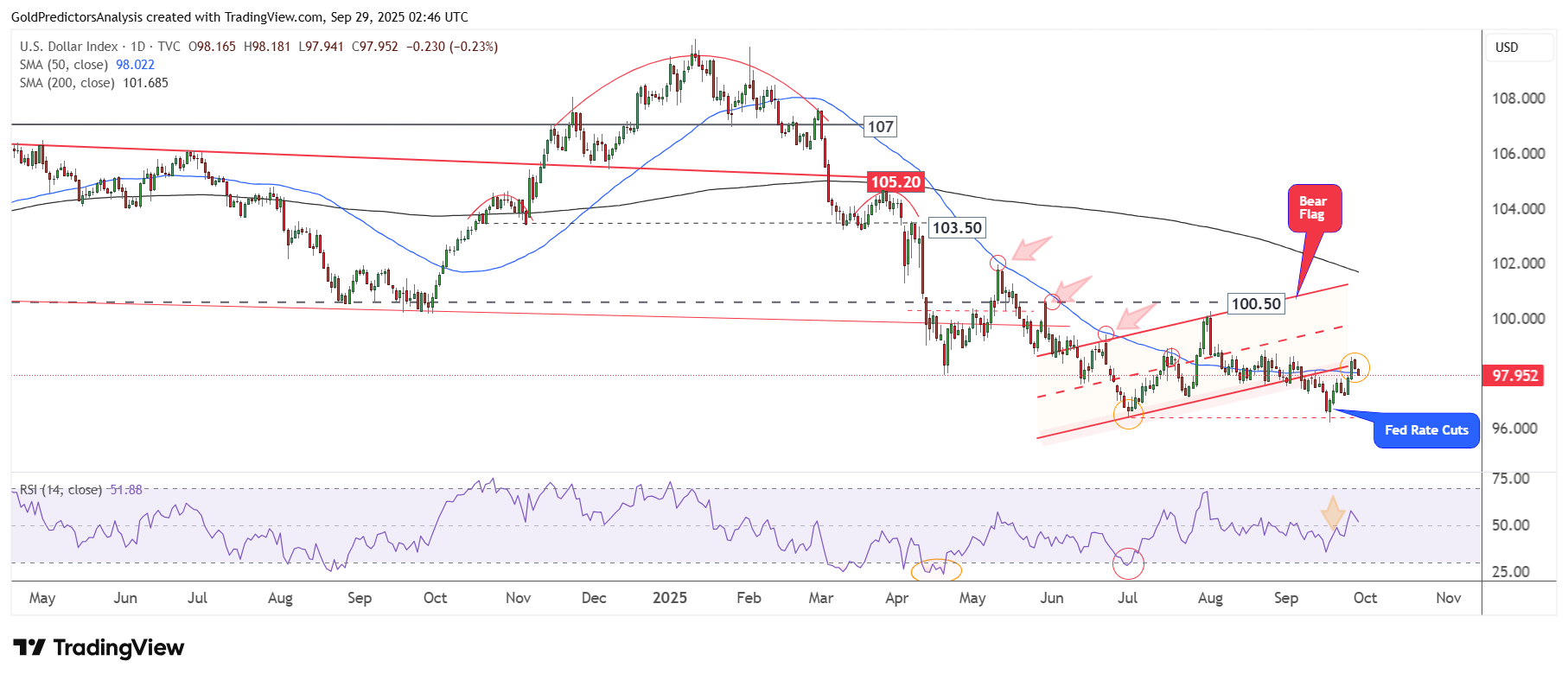 Chỉ số USD hồi phục từ hỗ trợ dài hạn quanh 96.50, lên tới kháng cự của mô hình cờ giảm. Diễn biến cho thấy chỉ số vẫn đang trong pha củng cố của xu hướng giảm rộng hơn. Kháng cự mạnh nằm trong vùng 100–100.50, và xu hướng kế tiếp nhiều khả năng vẫn là giảm.