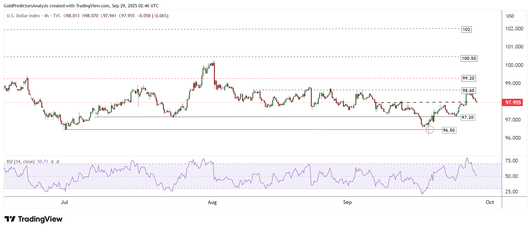 Trên khung 4 giờ, chỉ số dao động trong vùng 96–100 điểm. Sau khi chạm kháng cự 98.60, DXY đang điều chỉnh về quanh 98 điểm. Sự củng cố này không làm thay đổi triển vọng giảm chính. Nếu phá vỡ xuống, xu hướng giảm sẽ được nối dài; ngược lại, chỉ khi vượt 102 mới phủ định kịch bản tiêu cực và báo hiệu đà tăng mới.
