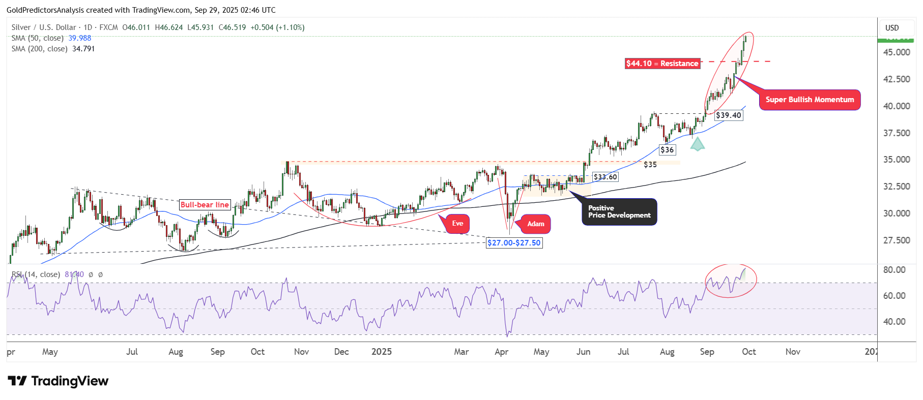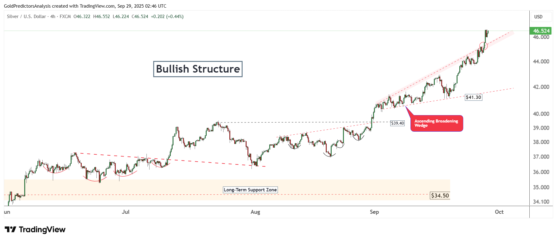 Trên khung 4 giờ, bạc đã phá vỡ mô hình cái nêm mở rộng tăng dần gần 45 USD, cho thấy giá thoát khỏi giai đoạn biến động cực đoan và chuyển sang pha tăng parabol. Việc vượt 48–50 USD sẽ khẳng định đà tăng mạnh mẽ và mở ra vùng đỉnh lịch sử mới.