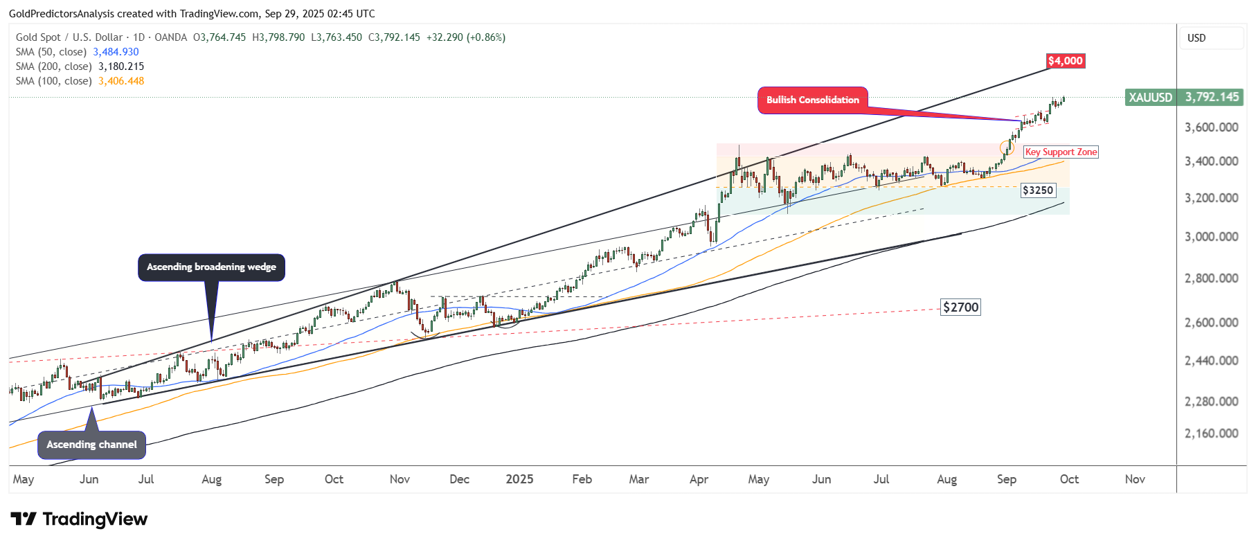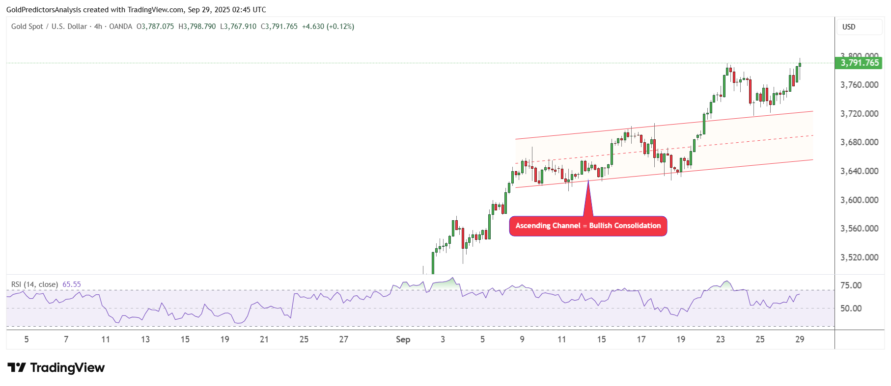 Biểu đồ 4 giờ cho thấy vàng đã phá vỡ kênh tăng dần, xác nhận mô hình tiếp diễn đi lên. Sau khi vượt 3,700 USD, giá đã đạt 3,800 USD rồi điều chỉnh nhẹ trở lại 3,700 USD trước khi tiếp tục bật tăng. Động thái này cho thấy triển vọng ngắn hạn vẫn nghiêng về xu hướng tăng.