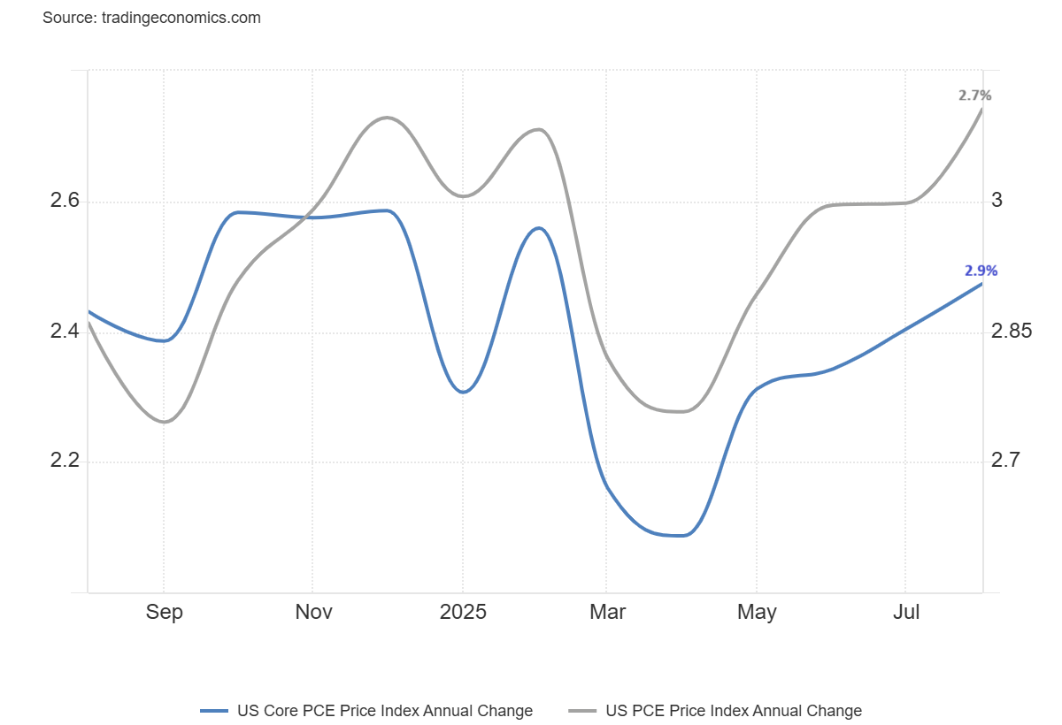 Báo cáo PCE tháng 8 cho thấy lạm phát ở mức 2.7% theo năm, trong khi PCE lõi giữ ổn định ở 2.9%. Các con số đúng dự báo, cho phép Fed tiếp tục lộ trình cắt giảm lãi suất từng bước mà không gây áp lực lạm phát mới. Điều này tạo nền tảng vĩ mô thuận lợi cho vàng: chính sách tiền tệ nới lỏng kết hợp với lạm phát ổn định.