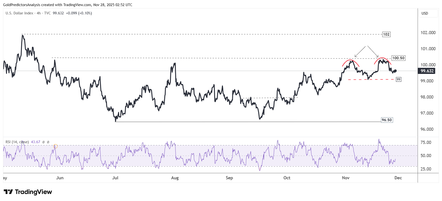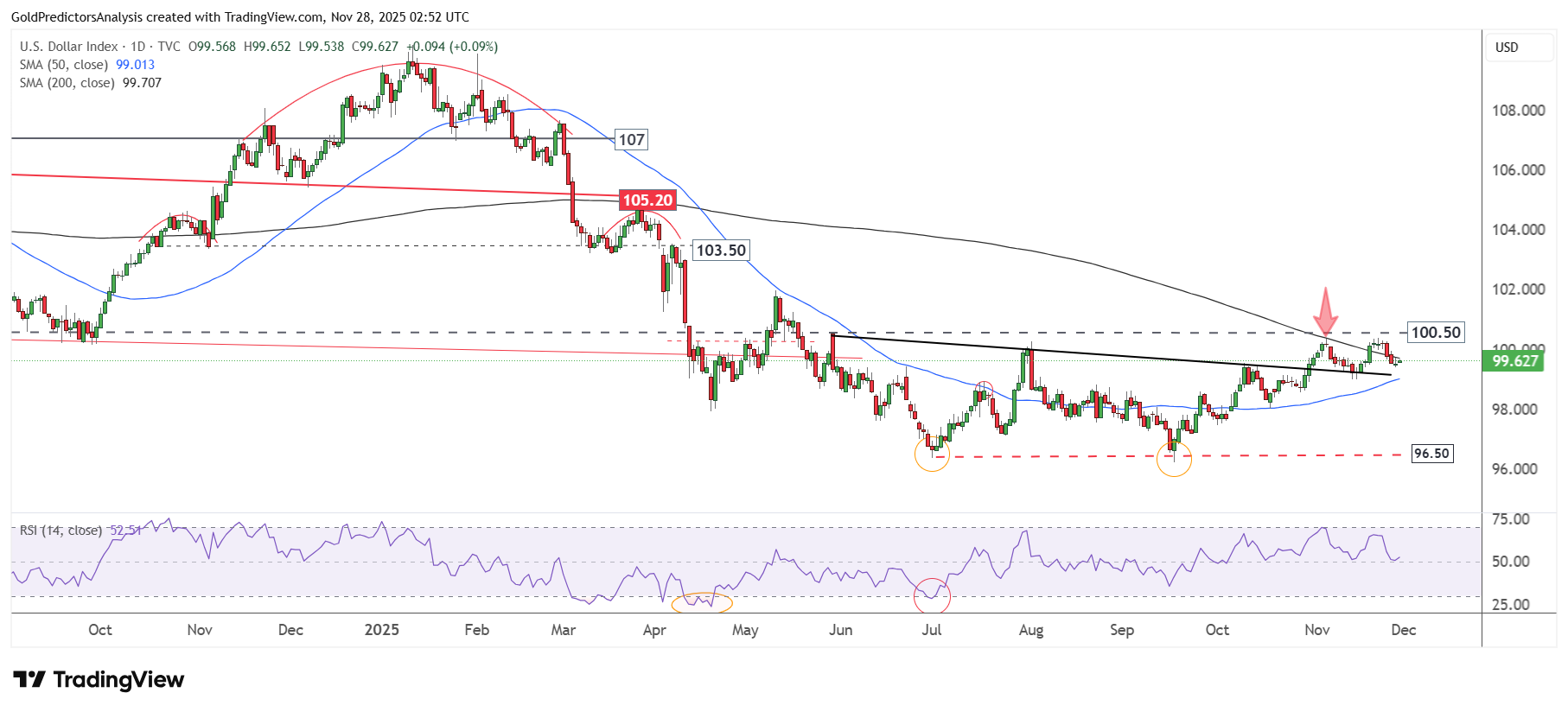 Biểu đồ ngày của DXY cho thấy chỉ số không thể vượt vùng đỉnh 100.50 và hiện đang củng cố quanh đường SMA 200. Nếu giá phá xuống dưới 99, áp lực giảm có thể mở rộng về 96.50. Tiếp tục xuyên dưới 96.50 sẽ xác nhận xu hướng giảm về vùng 90. Sự củng cố dài dưới 100.50 làm gia tăng sự bất định của USD.
