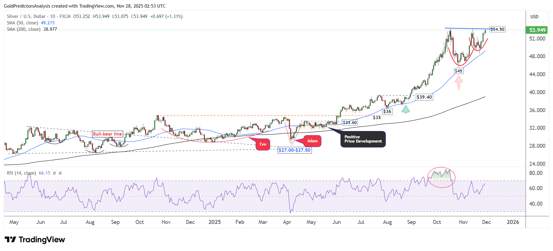 Biểu đồ ngày của bạc giao ngay cho thấy giá đang tiến sát đỉnh lịch sử $54.50 và dần hình thành động lực cho một đợt bứt phá mới. Nhịp phục hồi từ vùng $45 tại đường SMA 50 ngày là tín hiệu tăng giá. Giá đã hoàn chỉnh mô hình cốc và tay cầm trên SMA 50 ngày, cho thấy một đột phá trên $55 có thể kích hoạt một nhịp tăng mạnh của bạc.