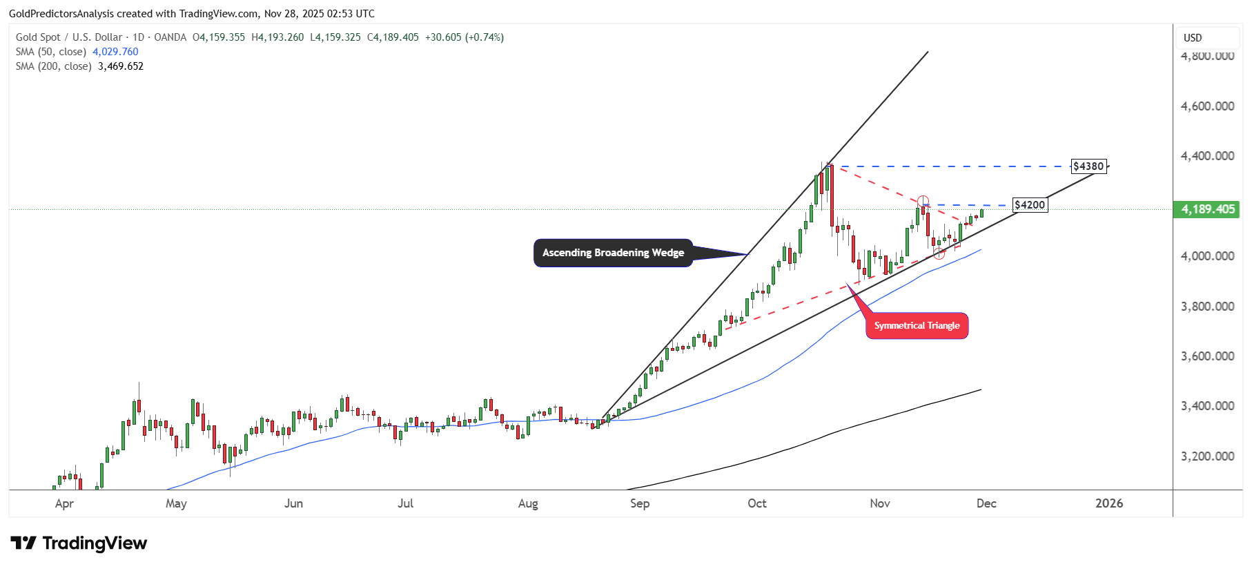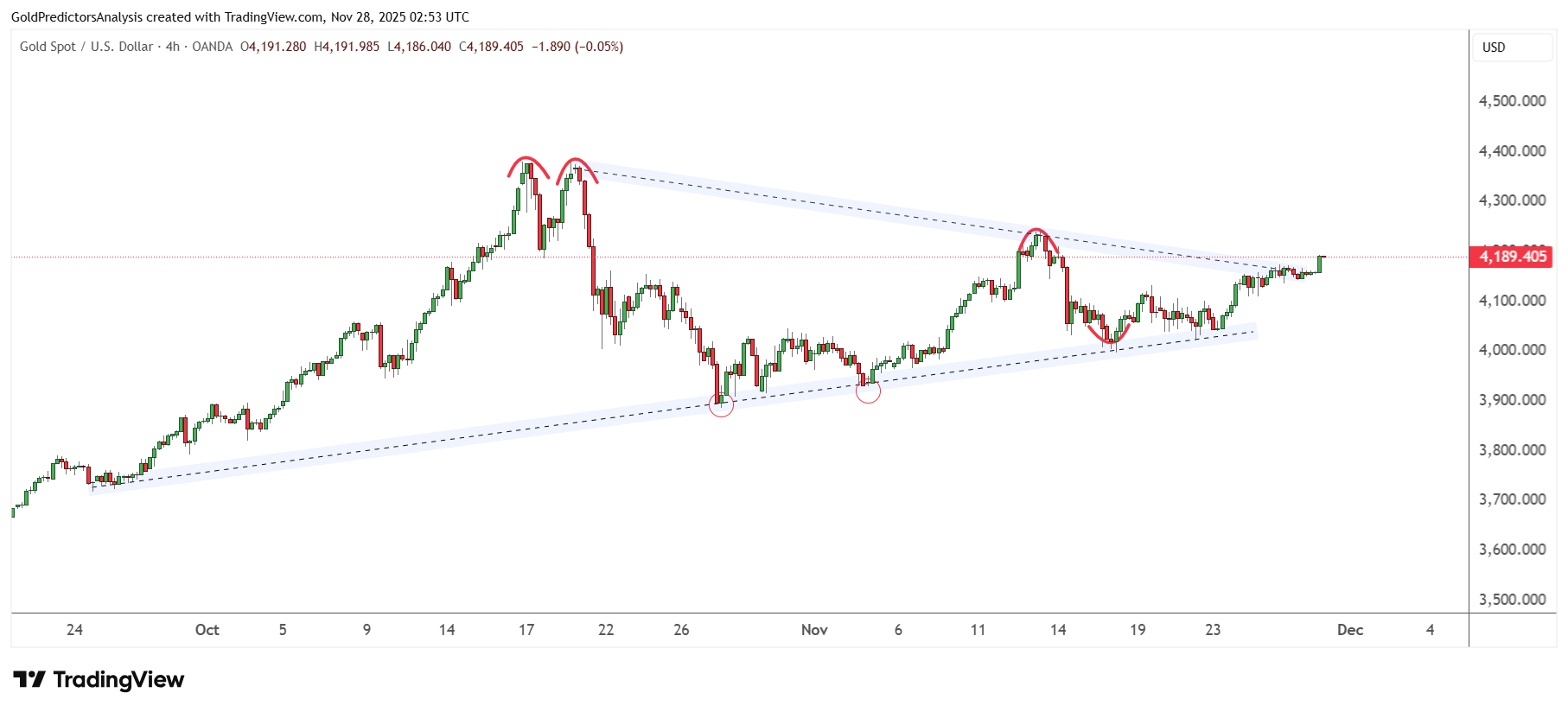 Biểu đồ khung giờ cho thấy giá đã vượt khỏi mô hình tam giác đối xứng và đang chuẩn bị tăng cao hơn sau giai đoạn củng cố theo mùa. Xu hướng chung vẫn là tăng, và một đột phá trên $4,380 sẽ xác nhận đà tăng tiếp diễn.